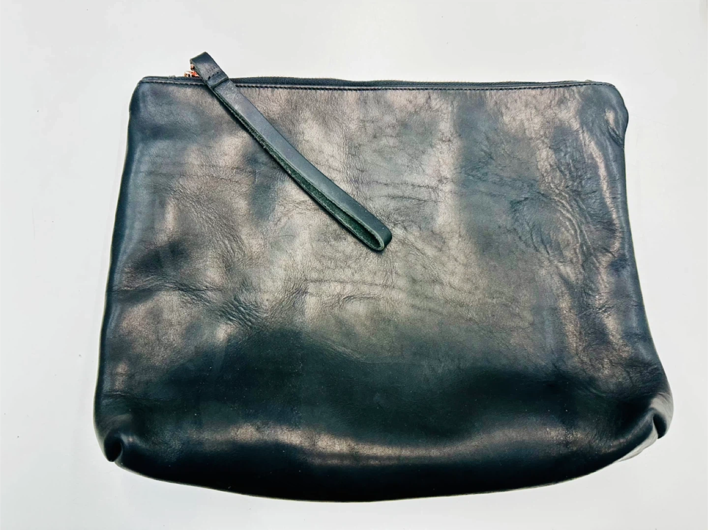 This black leather clutch bag features a convenient wrist strap for easy carrying. It's made from genuine leather. This bag's sleek design makes it suitable for various occasions. Optional baby changing pad. Interior pouch lining wipeable. Made in nyc.