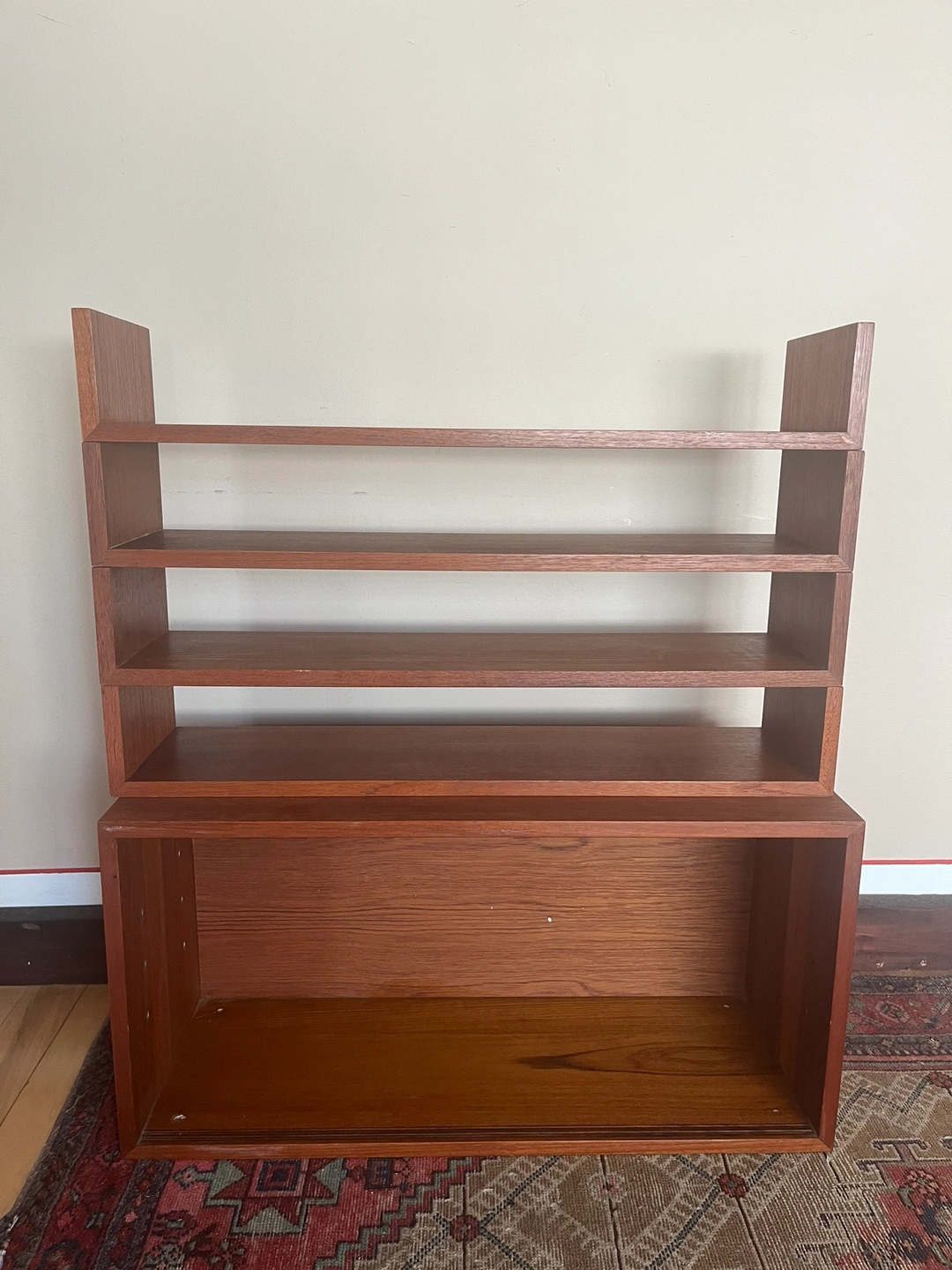 Features 4 shelves and 1 cabinet. The cabinet had glass shelving and glass doors originally. However it is missing both. It also has 4 holes where legs were drilled into by previous owners. Vintage wear overall. The cabinet top was refinished. All pieces have been oiled. Some chips and nicks in the shelving.