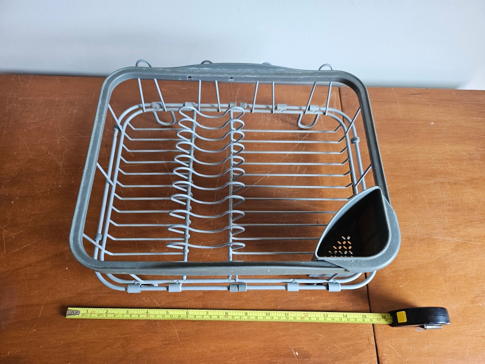 Dishrack originally from Winners, by the brand Umbra. It has extending wings so it can rest on the edges of a sink, or with the wings tucked it can rest in the bottom of the sink.