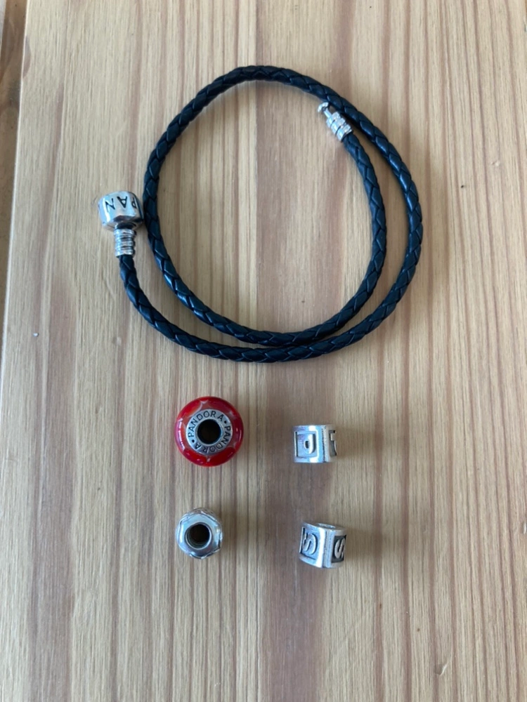 Charm bracelet and charms are from Pandora, however only the red glass one states it clearly. 3 charms are silver and are indicated on the charms. Happy to send more pics if needed
