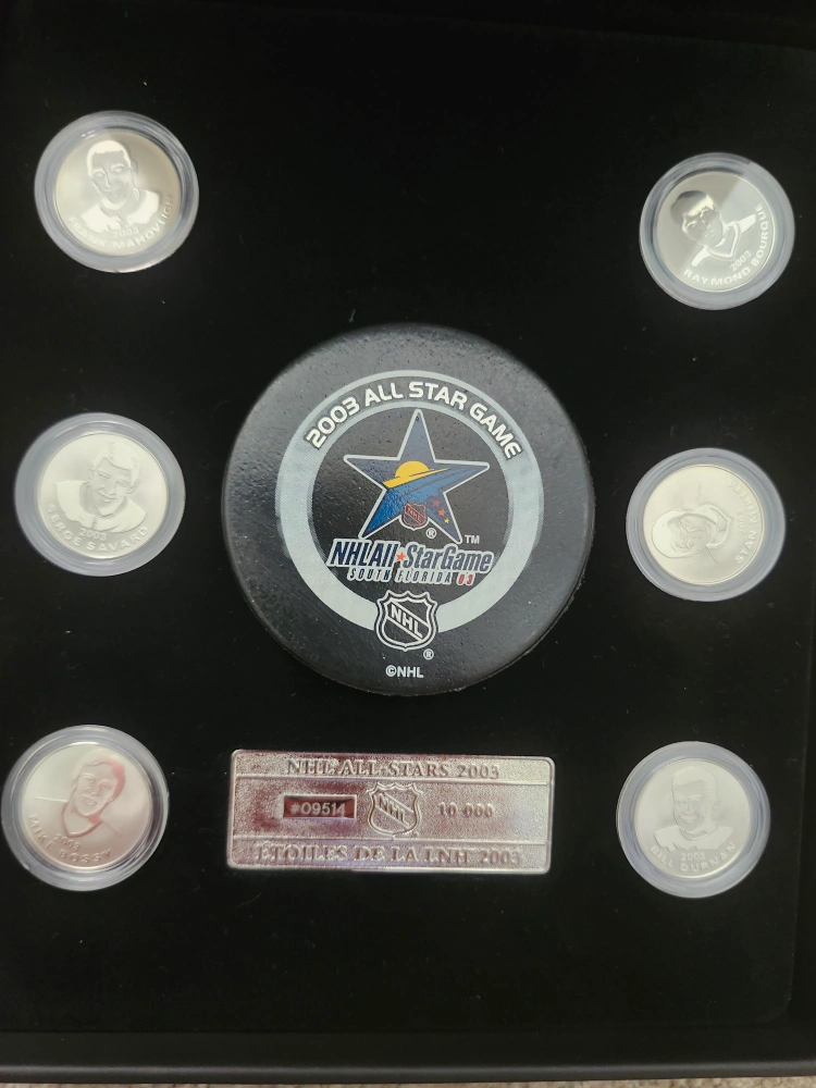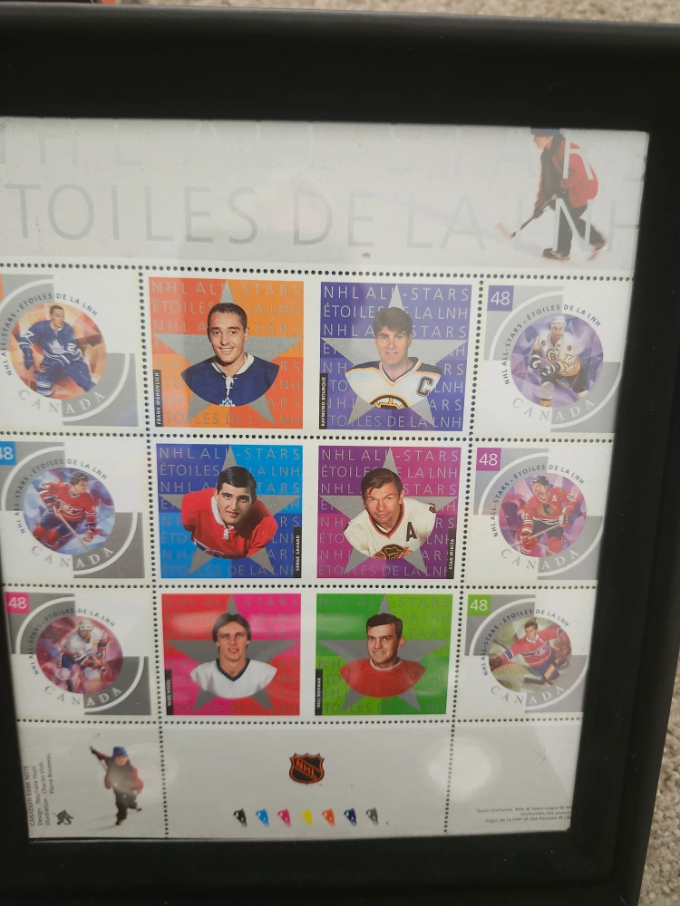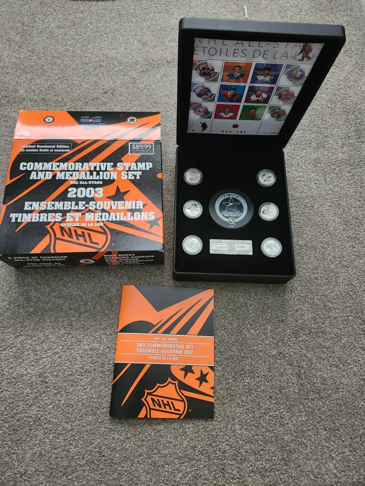 NHL COMMEMORATIVE STAMP AND MEDALLION SET. Frank Mahovlich,Ray Bourque,Serge Savard,Stan Mikita,Mike Bossy and Bill Duran.comes with display case, bio book and original box.
