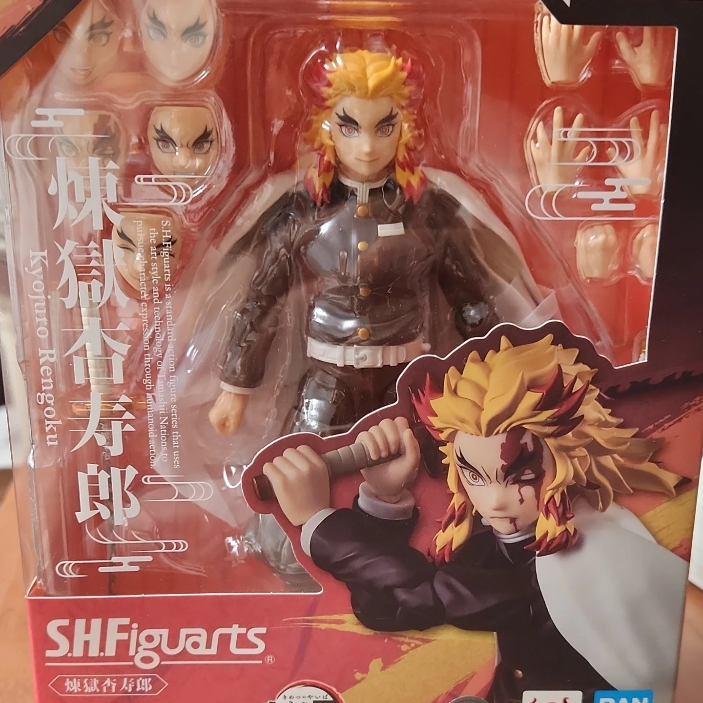 This S.H.Figuarts action figure depicts Kyojuro Rengoku. It's part of a standard action figure series focused on character expression. Includes interchangeable parts for dynamic posing.