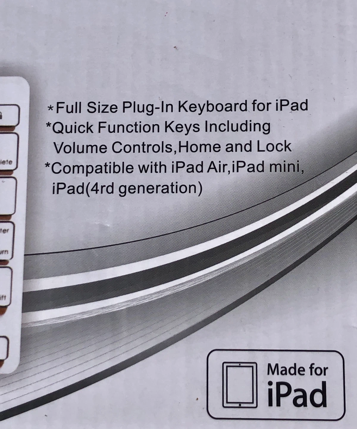 Selling a YBK-S0808 full-size plug-in keyboard for iPad! It's compatible with iPad Air, iPad mini, and iPad (4th generation). It also has quick function keys including volume controls, home, and lock. Comes in the original box