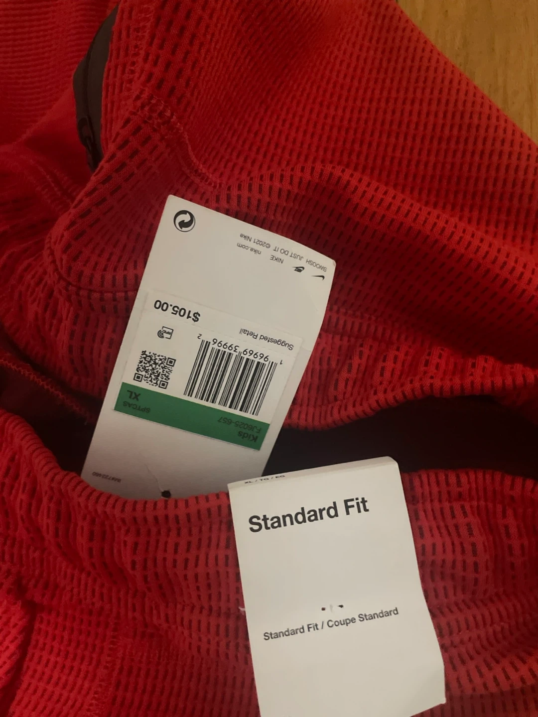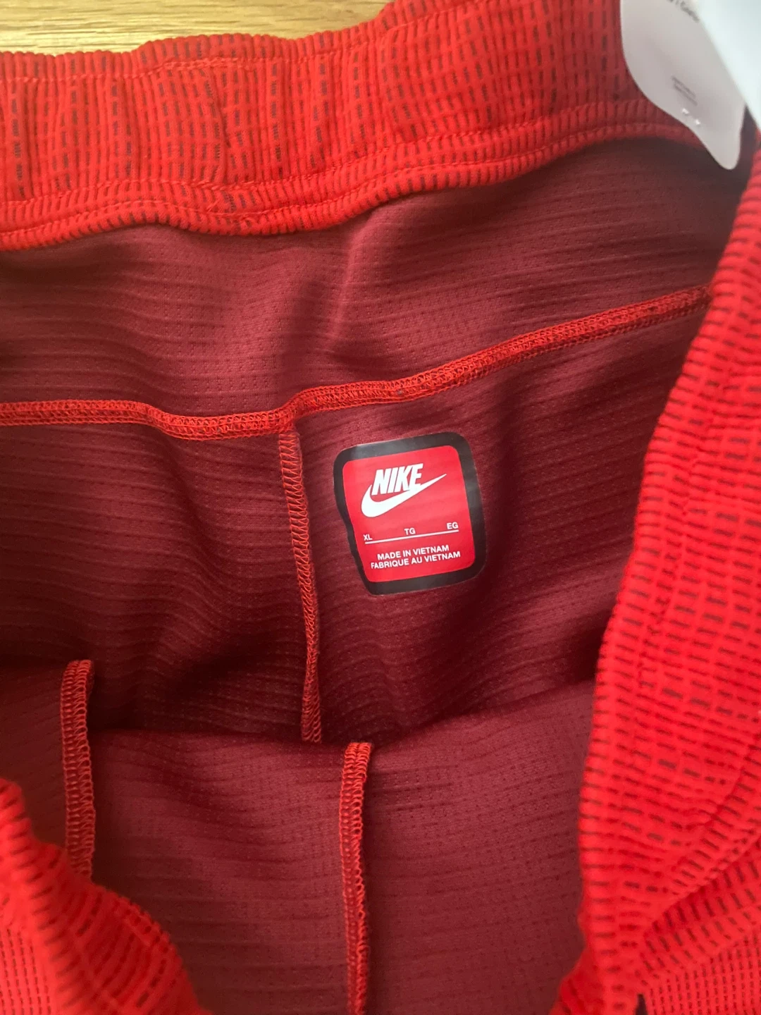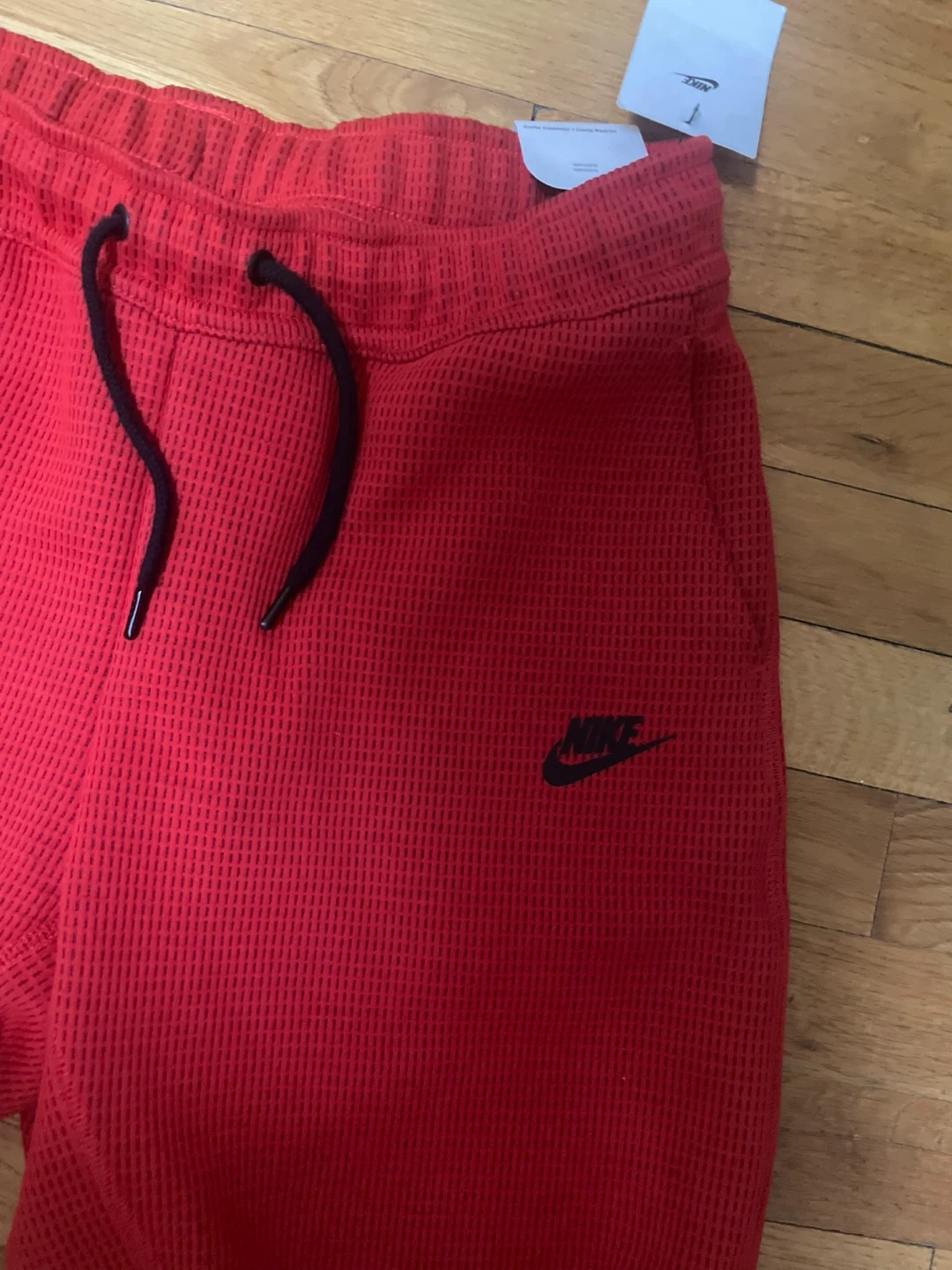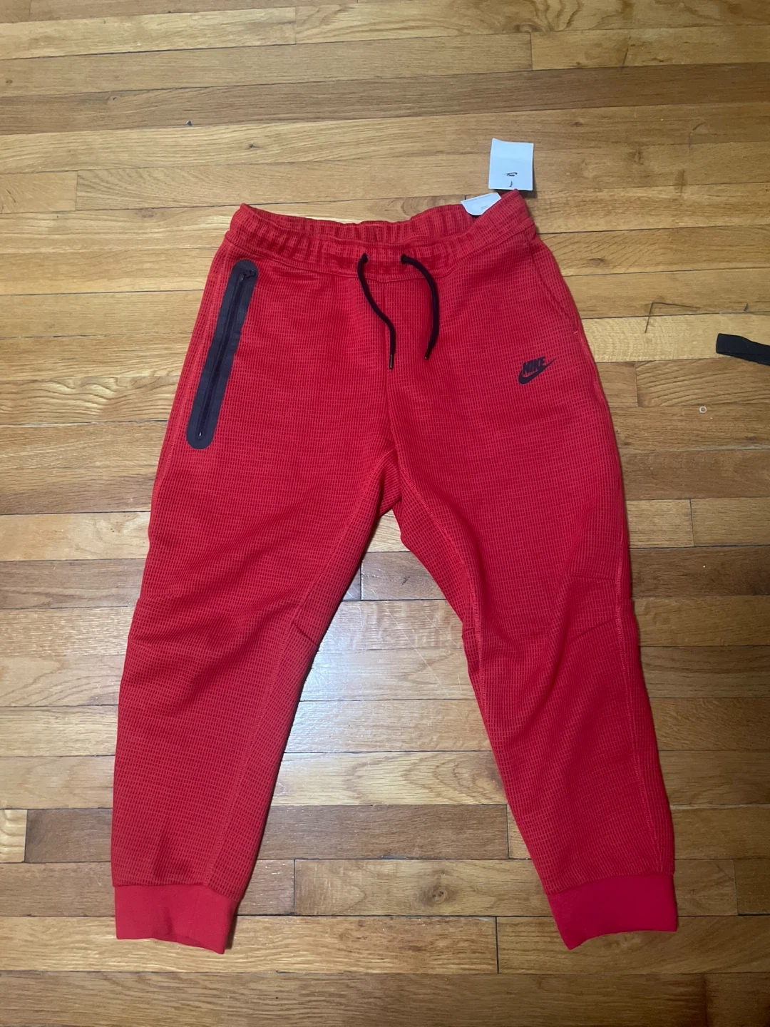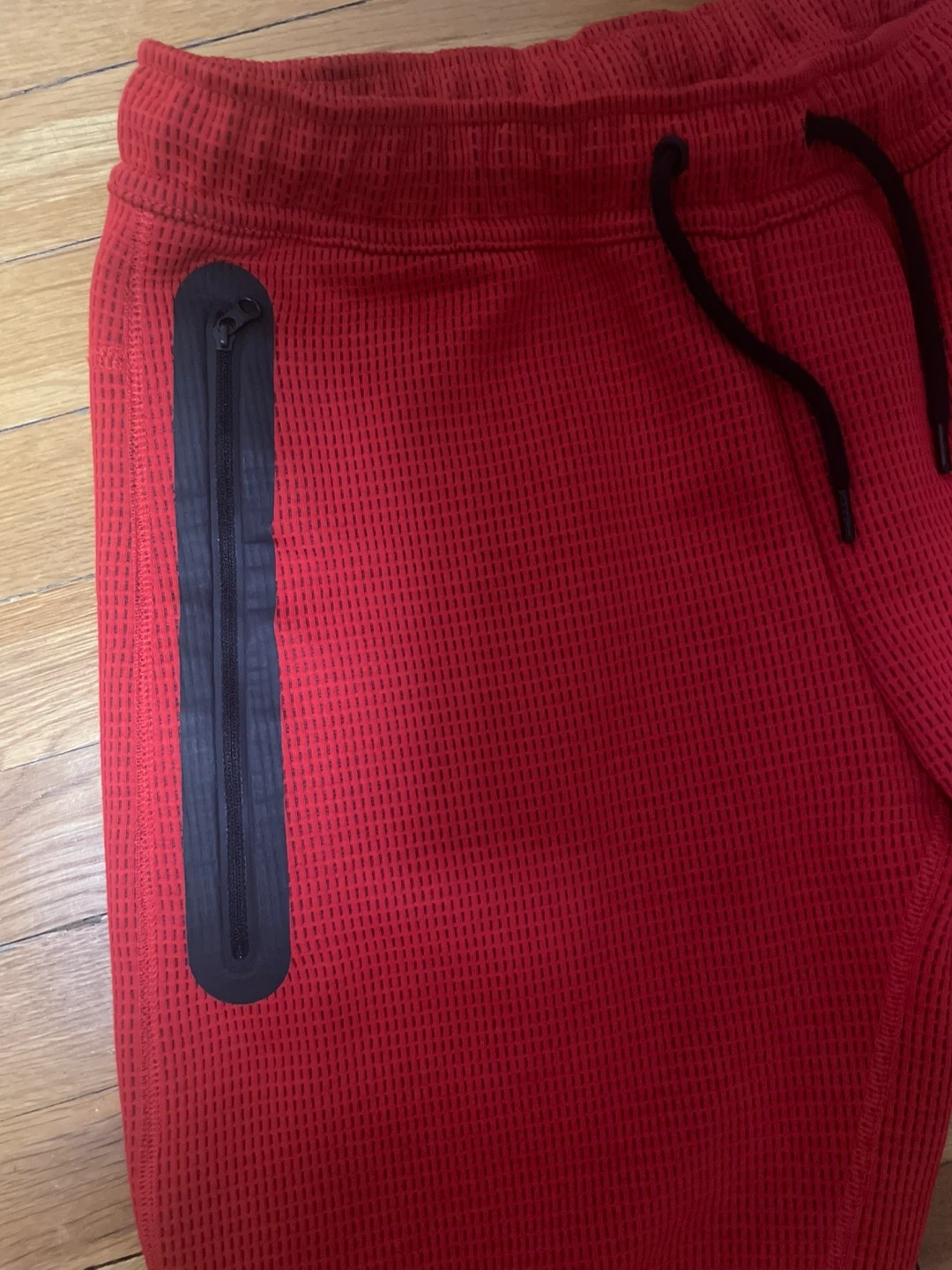 Kids Nike Tech Fleece joggers in red. Features a waffle knit texture and a zippered pocket. Size XL. Standard fit.