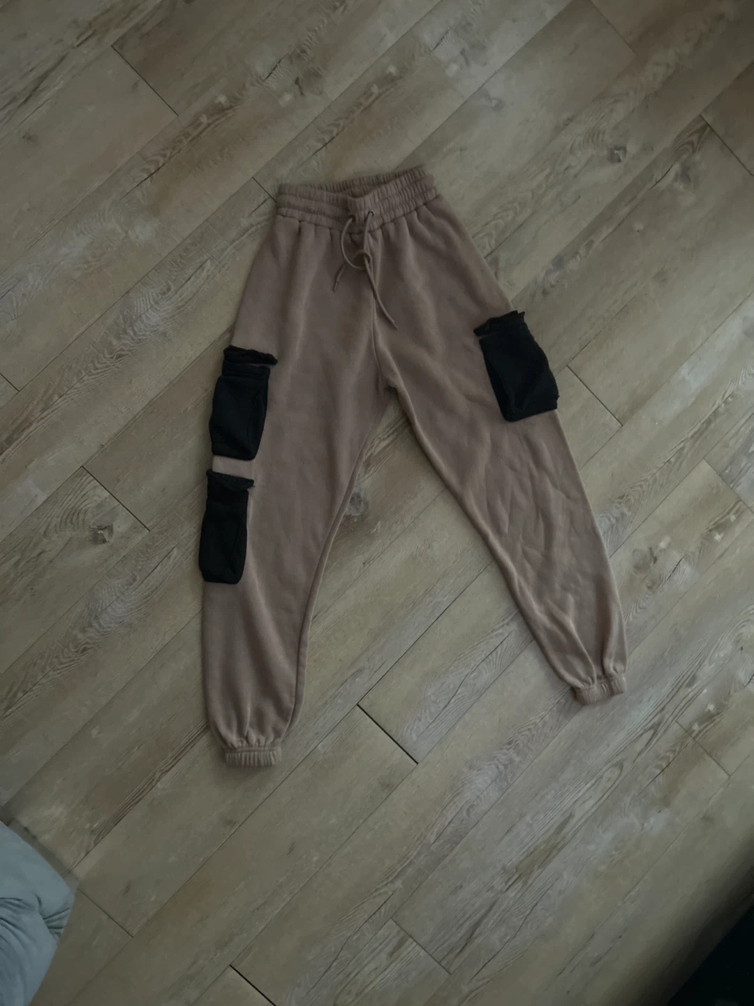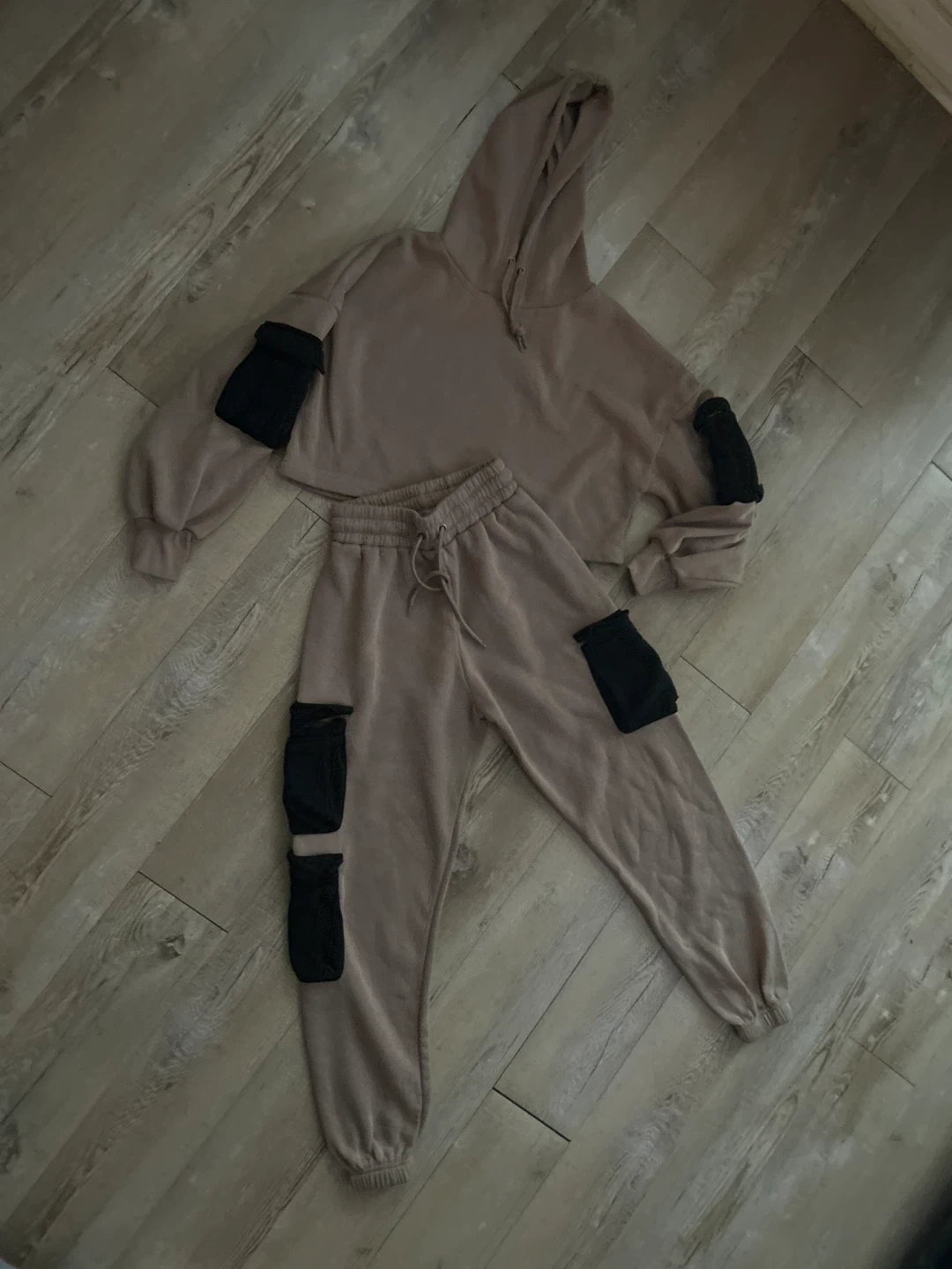This brown loungewear set includes a cropped hoodie and matching joggers. Both pieces feature decorative black cargo-style pockets. The hoodie has a drawstring hood, and the joggers have a drawstring waist.