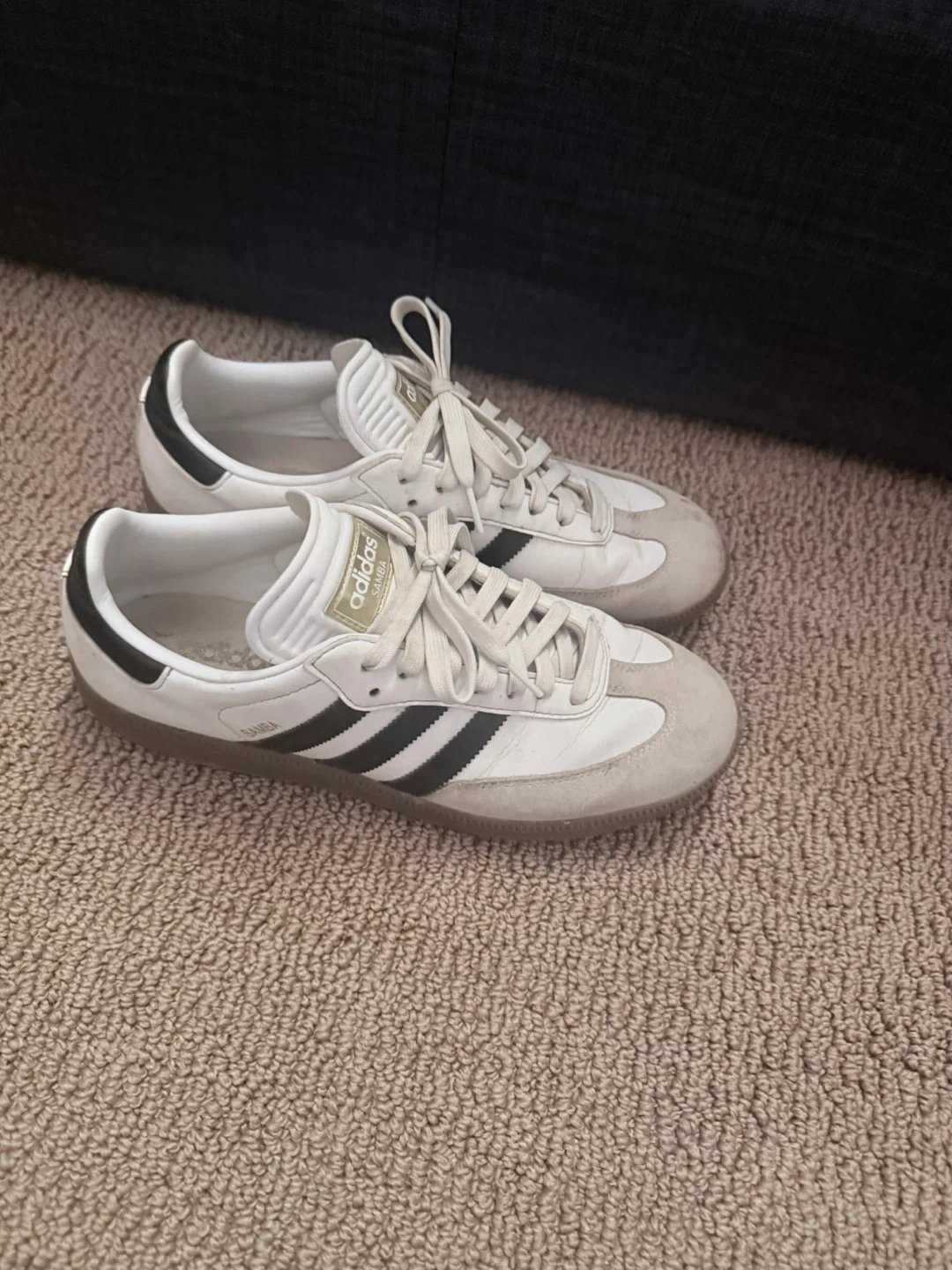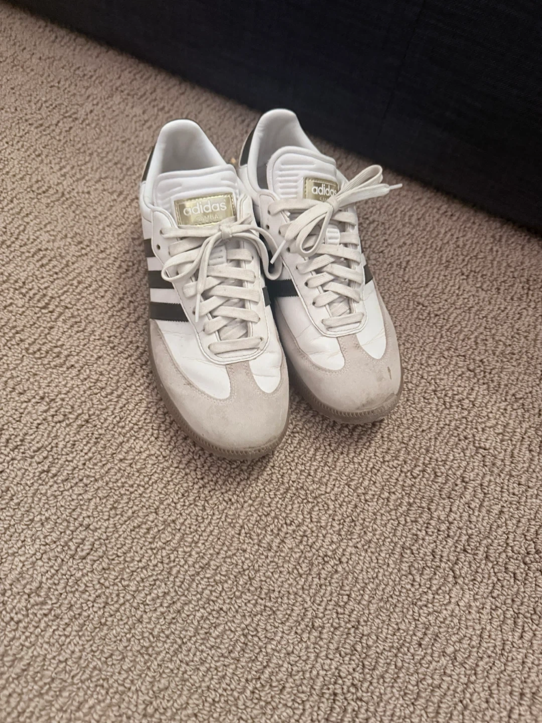 Adidas Samba OG shoes in white and black. Classic low-top design with suede toe cap. Leather upper with signature three stripes. Rubber gum sole.