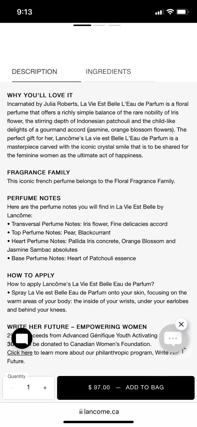 Hi there, I’m selling a 30ml bottle of Lancôme La Vie est belle- L’eau de Parfum. It’s a lovely scent, & lasts long (when sprayed) as it’s perfume & NOT an eau de toilet. I received as a gift, and only sprayed twice. It’s a full bottle. Retails for $97 plus tax. I’m selling for only $50 msg me if interested. Final Sale. Non refundable.