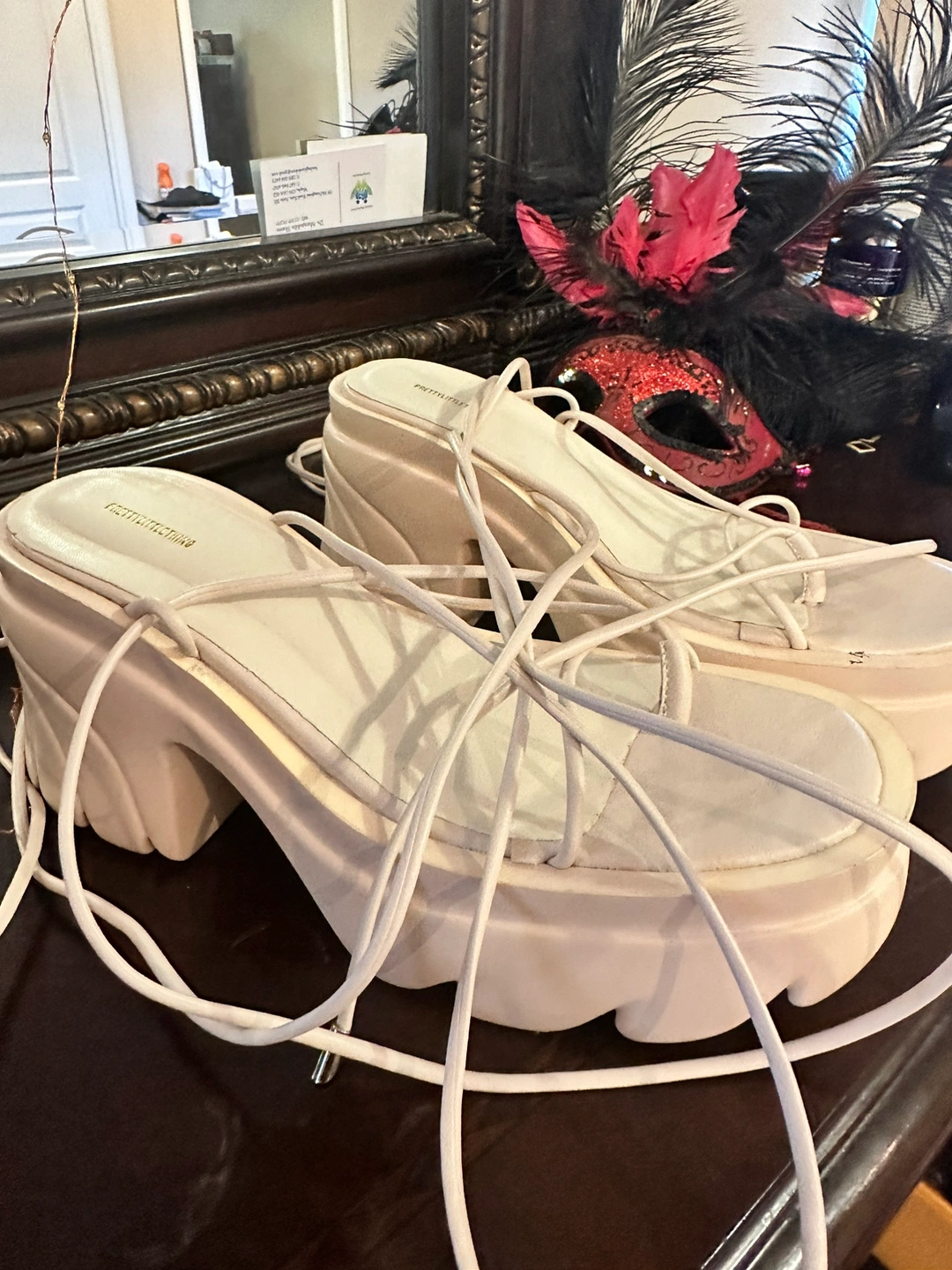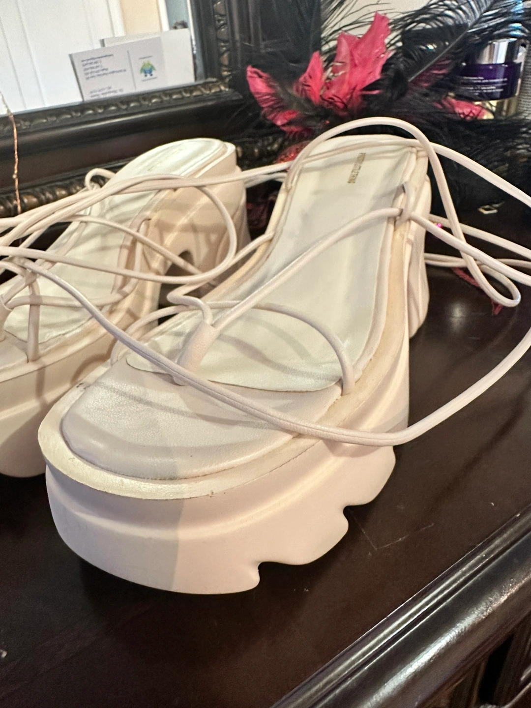Selling my off-white chunky strap wedge sandals from Pretty Little Thing UK! These stylish sandals are incredibly comfortable and versatile, perfect for dressing up or down. You can wear them for long hours, even by the beach. They have only been used once and are in excellent condition. Don't miss out on these fantastic sandals!