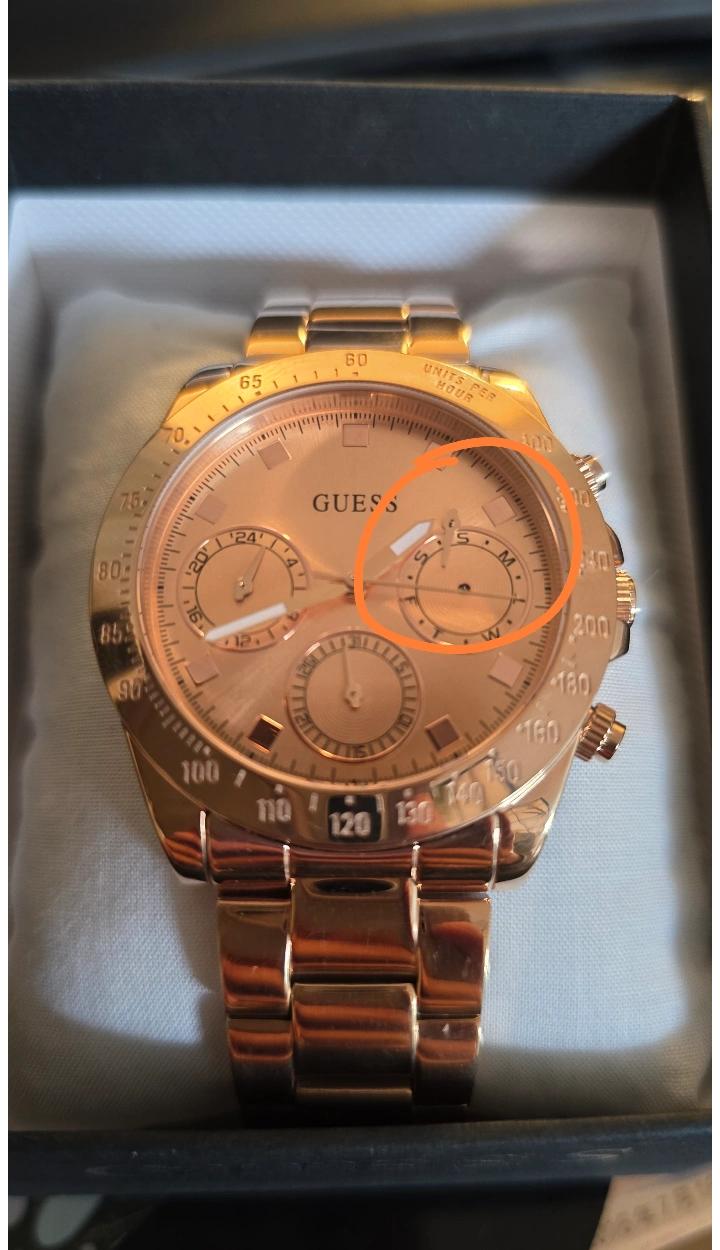 The watch was purchased used, we don't have the original receipt. My partner didn't notice the broken hand on the watch face. The rest is in perfect condition.