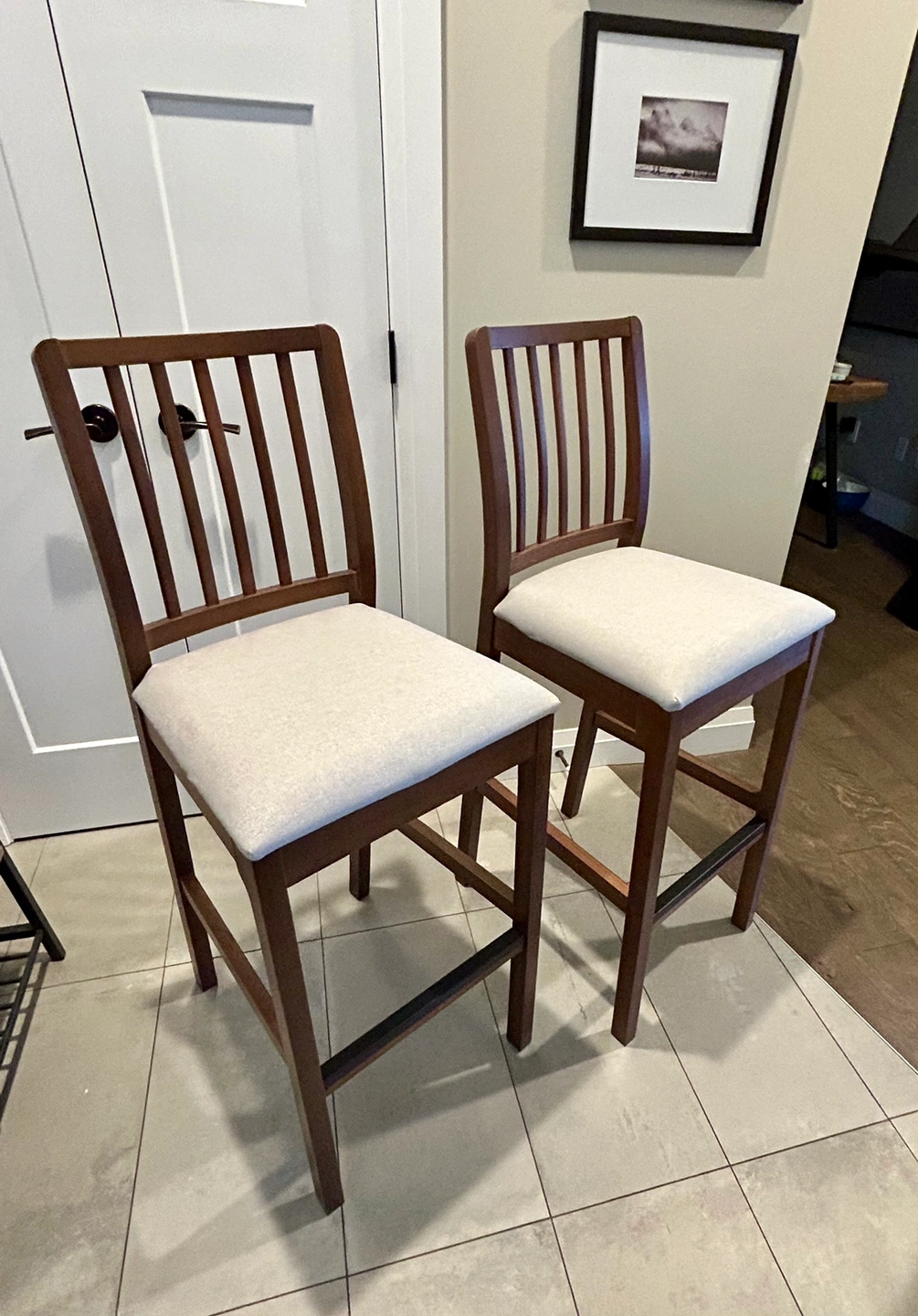 Mint condition, just like new 2 EKEDALEN Barstools. Brown with light grey seat cushion. Just bought them hoping I could buy 2 more but I cannot find the same color wood so I am selling as I bought 4 different ones. Just paid $150 2 days ago, willing to take $80 obo. Pick up or drop off on south side.