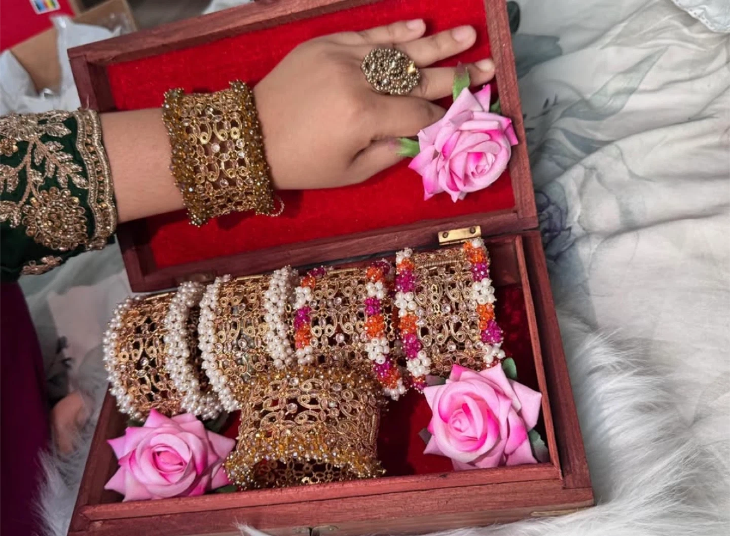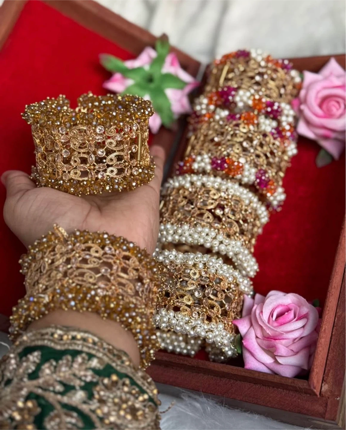 Each one is $25-30. This set includes several embellished gold-toned bangles and a matching wide cuff bracelet. They're adorned with beads and faux pearls. This set offers a complete look for traditional occasions!