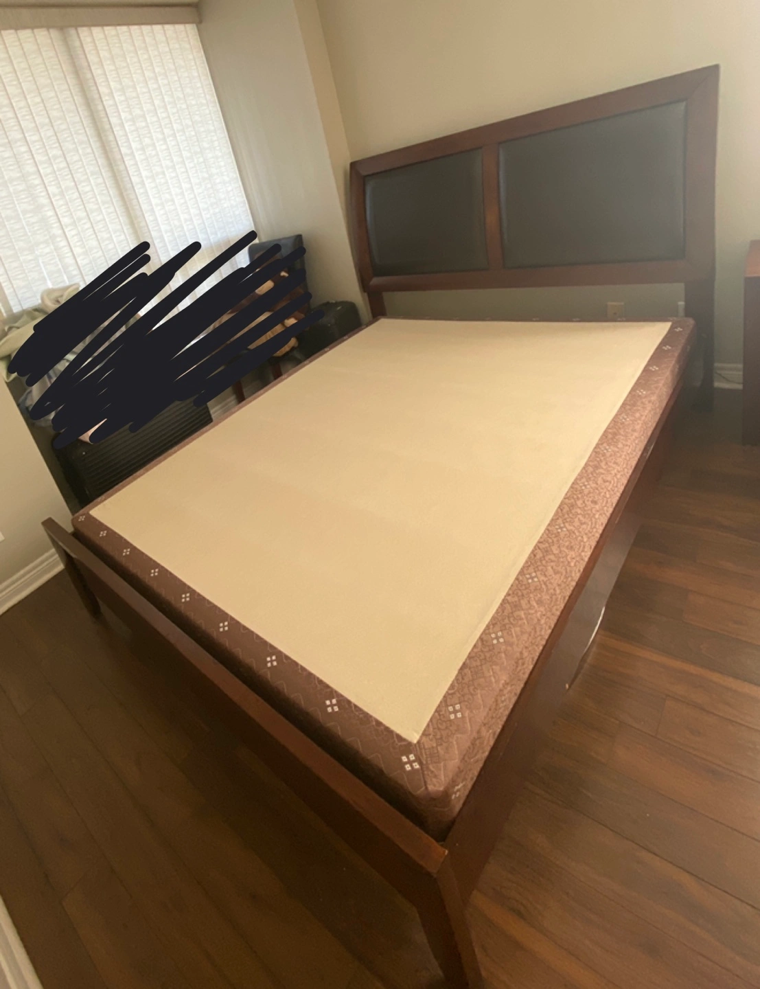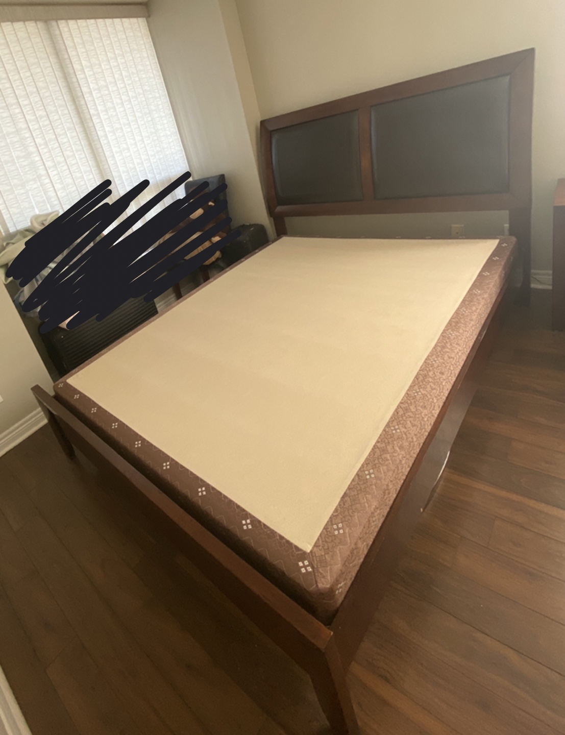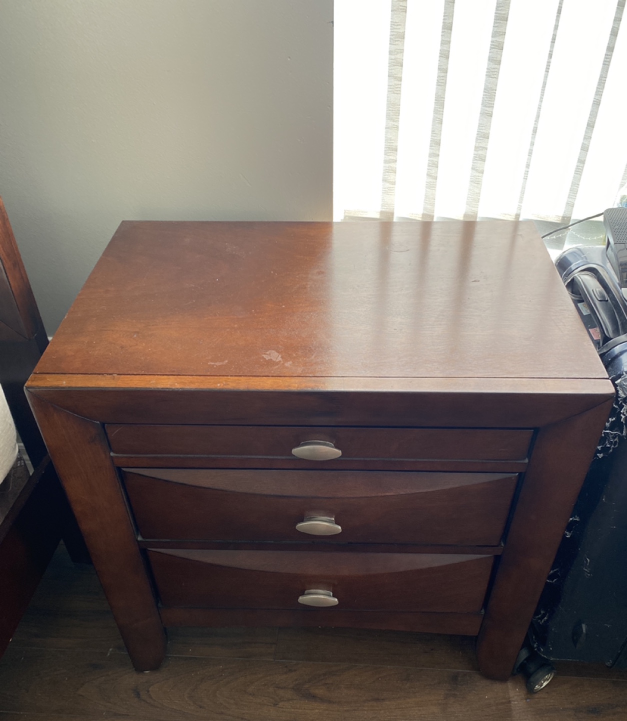 A good, sturdy, wooden bed frame. Some traces of wear (see all photos). Bought it together with a nightstand, so selling as a set. I got these two from Bad Boy. 2 items for $80, price is negotiable. Available today and tomorrow.