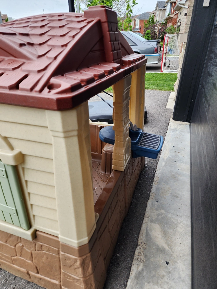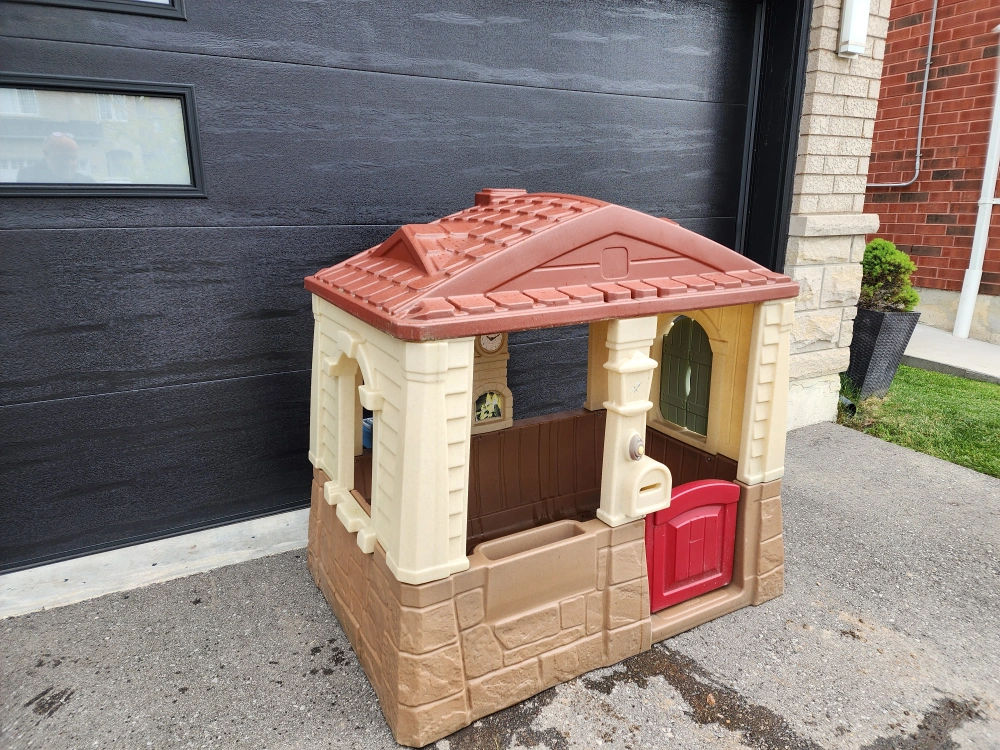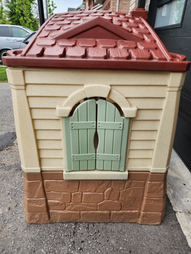 Good condition children's play house with front door that opens, side window has shutters that open and close and their is a play sink.