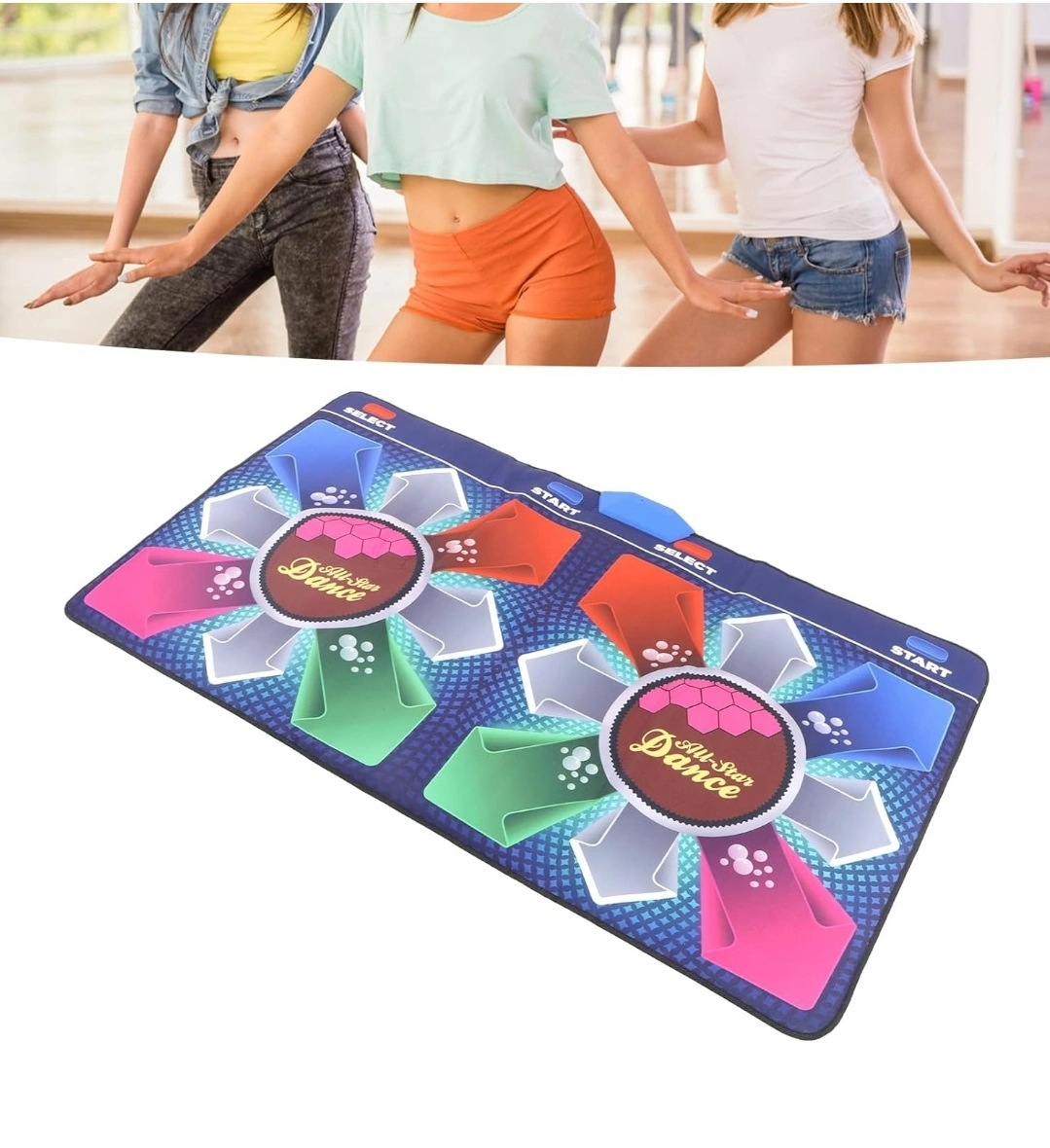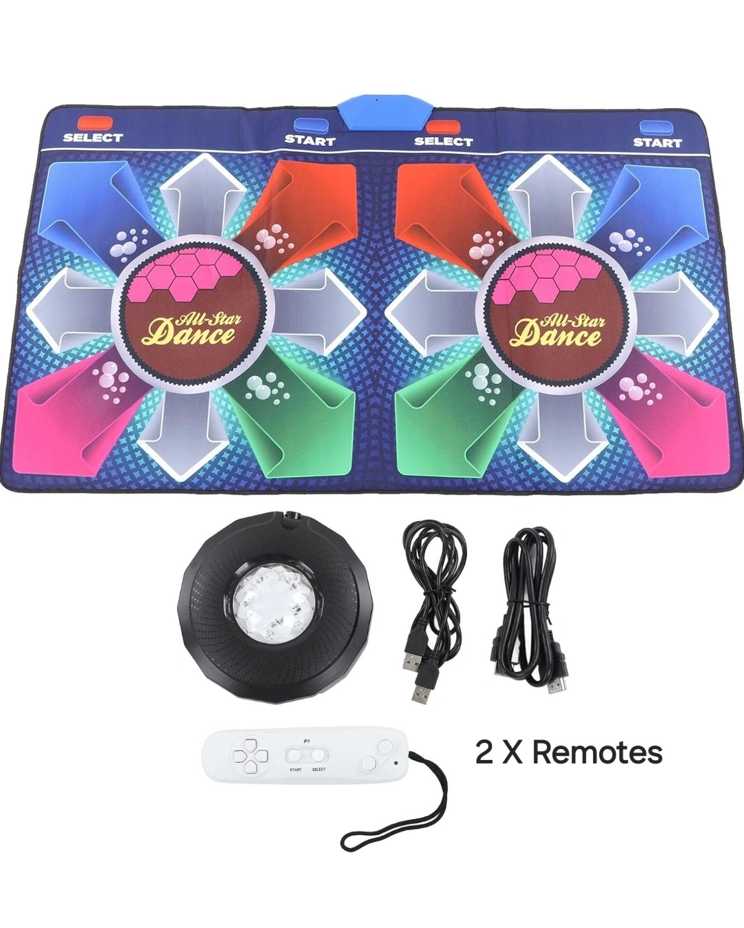 Get ready to dance with the Double Dance Mat by Bewinner! This Wireless AR Electronic Dance Pad measures 65.4 x 36.2 inches. The multicolor nylon material and padded features make it comfortable for players to dance on, allows for easy connectivity with HDMI option.