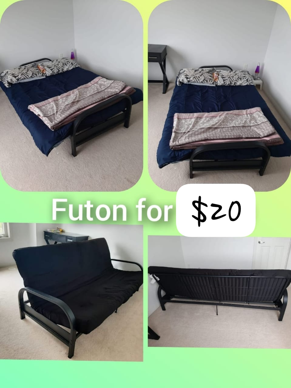 It is a metal futon with mattress and been used for 1 year. It is queen sized bed. When it is a couch, 3 people can sit comfortablely.