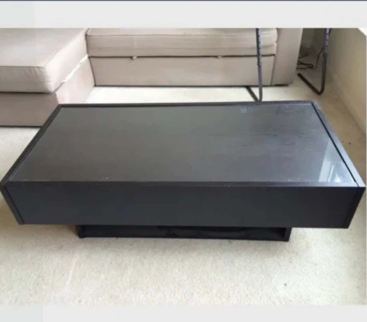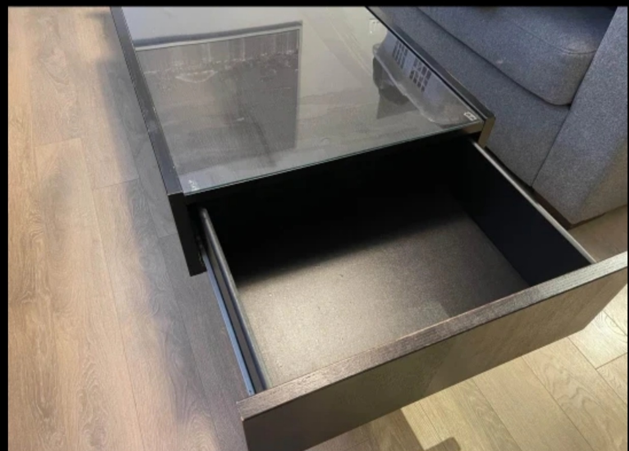 I am the only owner of this great coffee. It is very gently used condition. No dents, scratches on the wood. The only wear is just along the edge where I put my feet up. I use a dark wood stain pen on the edges to make it look almost new. It has a removable tempered glass top and two huge drawers for storage at each end. Sturdy, heavy and super practical with a lot of storage space! Asking $150.00 OBO