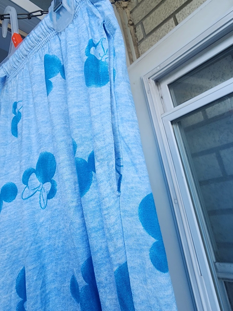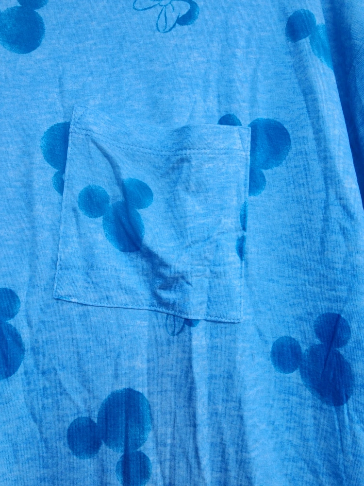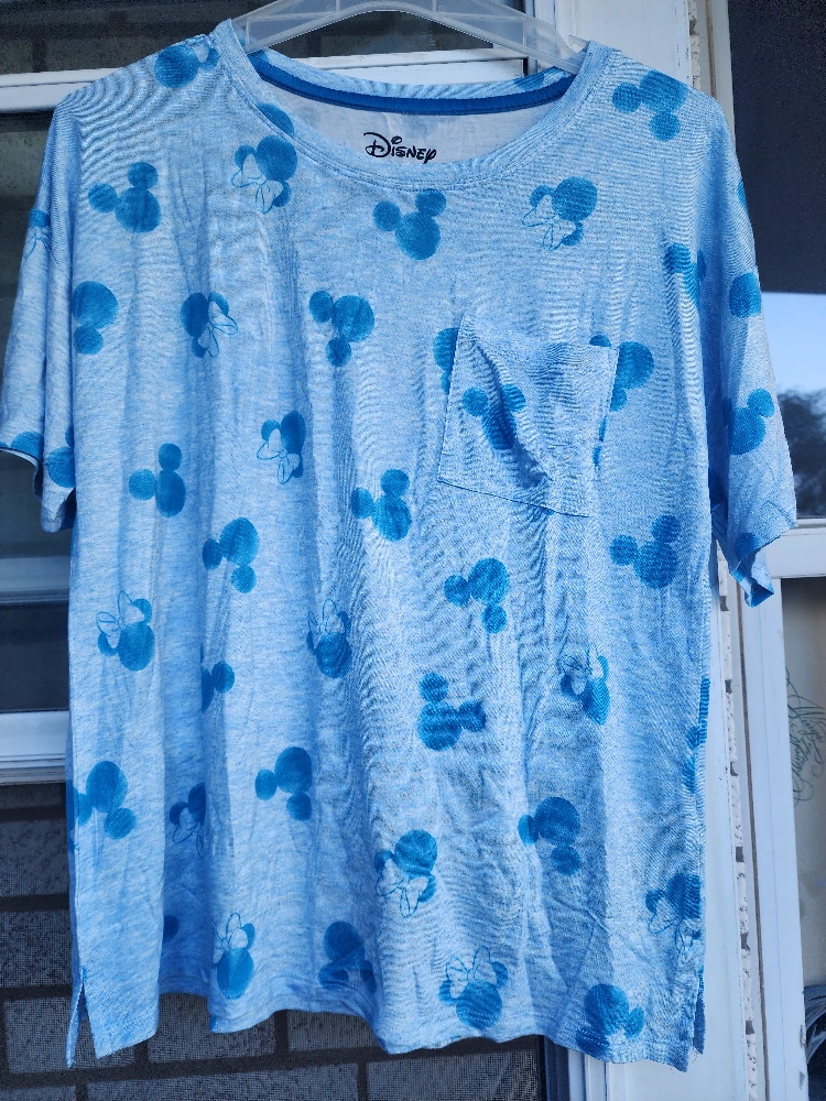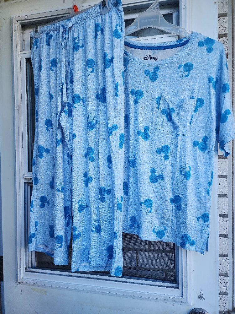 Light blue pj top and bottoms with Mickey & Minnie printed all over. Top and bottoms also have a pocket. Very light and great for the summer.