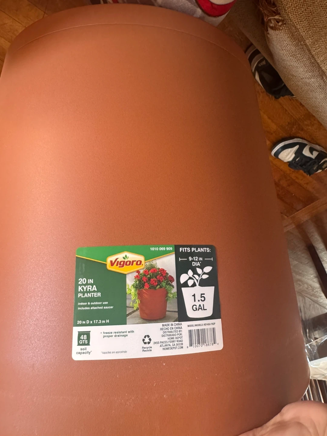 This is a Vigoro 20 inch Kyra planter. It's made for indoor & outdoor use and includes a saucer. It has proper drainage and is freeze resistant. This planter is 1.5 gallon capacity.