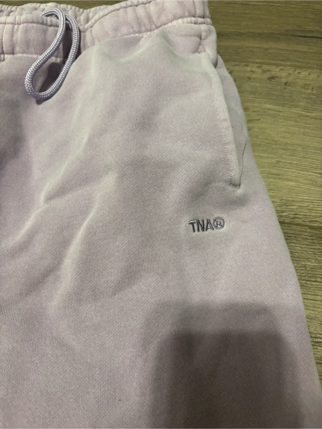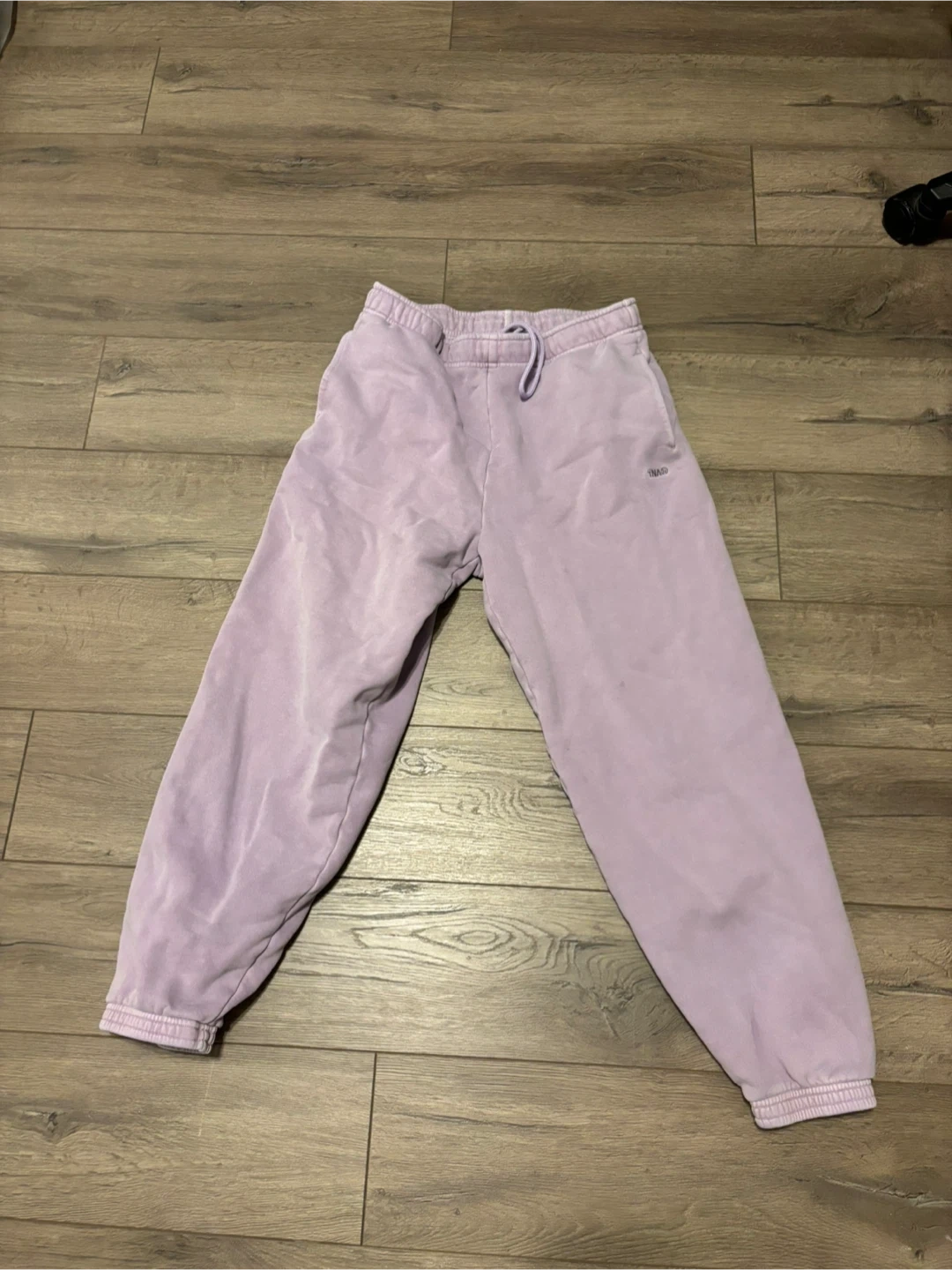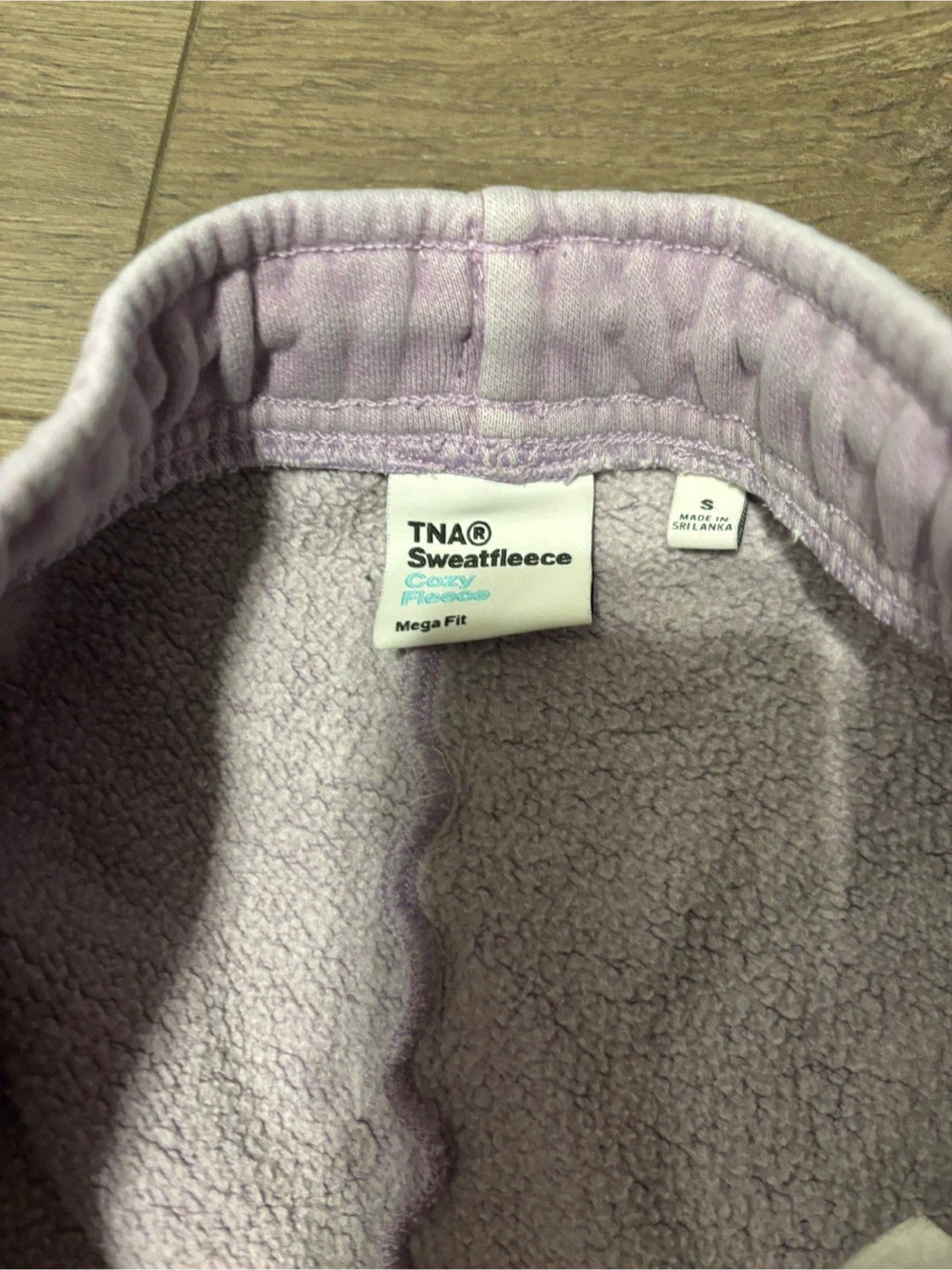 Selling a pair of TNA Sweatfleece Mega Fit pants in a lovely light purple colour! They are a size small. The material is super soft and comfy, perfect for lounging around the house or running errands