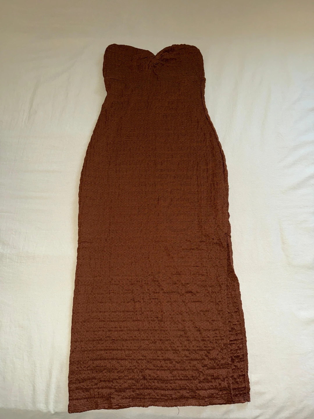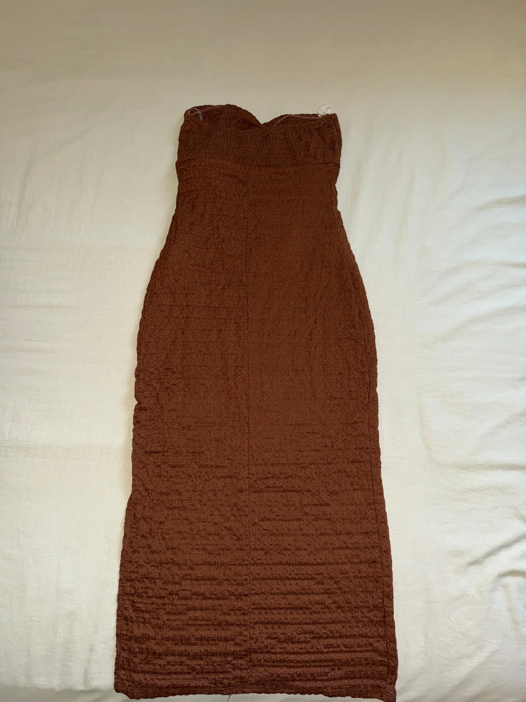 Selling a brown strapless dress. It's in great condition and ready for a new owner! The dress has a unique textured pattern throughout.