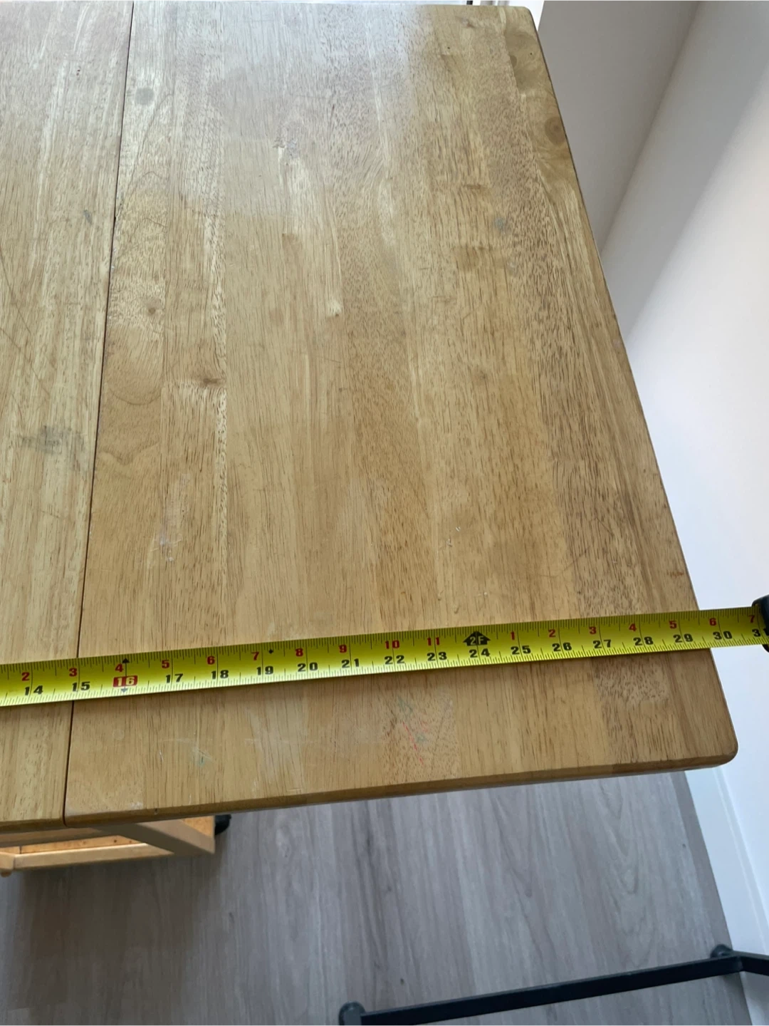 This is a natural wood kitchen cart with two drawers. It comes with two stools that tuck underneath for easy storage. The cart has wheels for mobility and is made of solid wood.