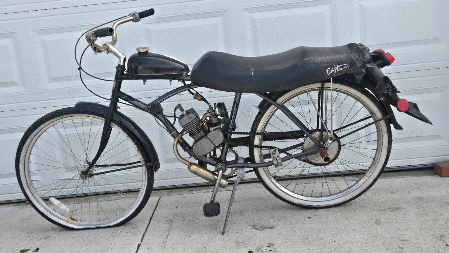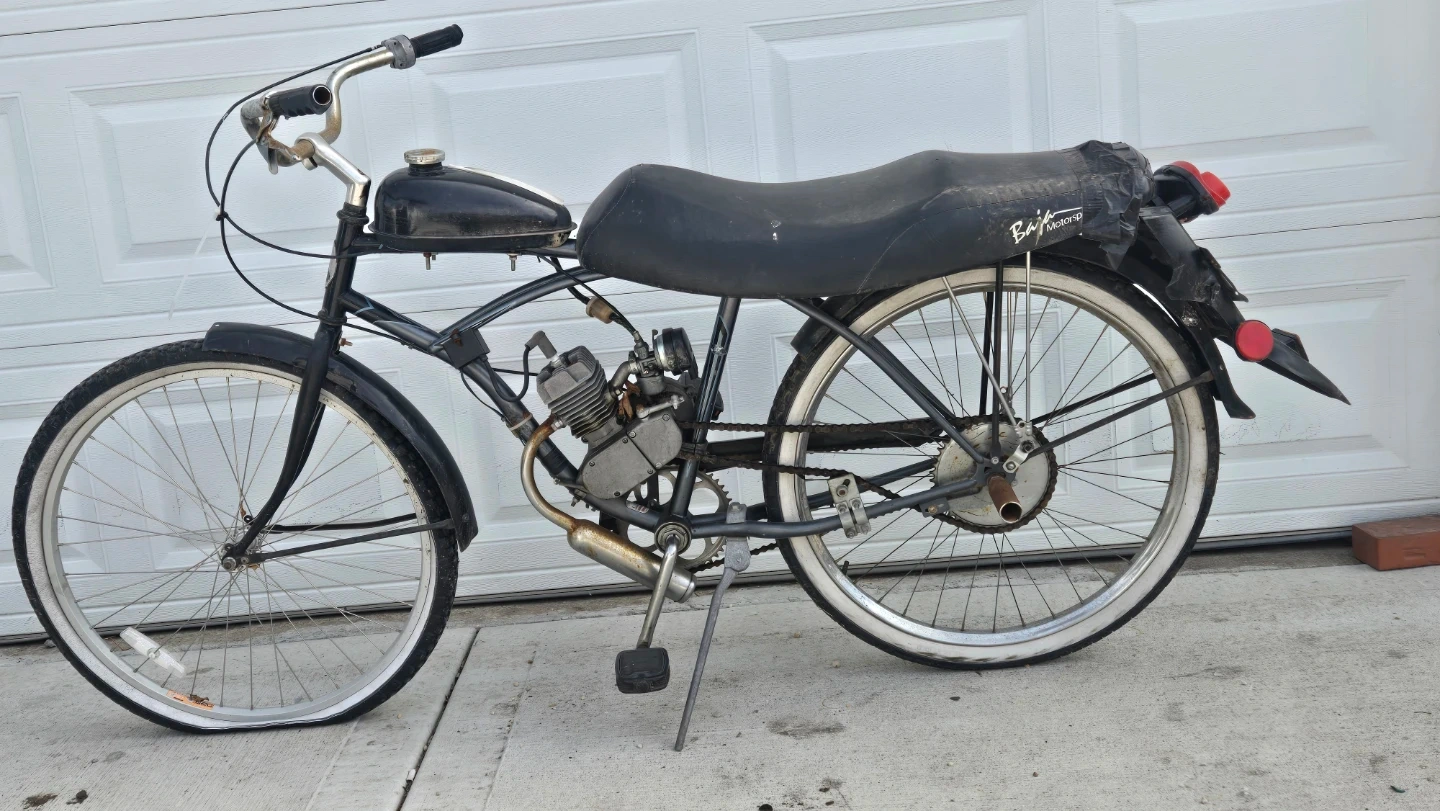 This is a black motorized bicycle with a black seat. It has a gas tank and an engine. It's a fun way to get around. But it does need a bit of mechanical work.