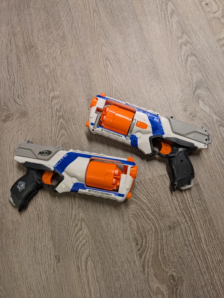 These Nerf guns are in great condition as we rarely used them. Comes with 2 Nerf Strongarm Elite and some darts (regular and suction tip). Selling all together.