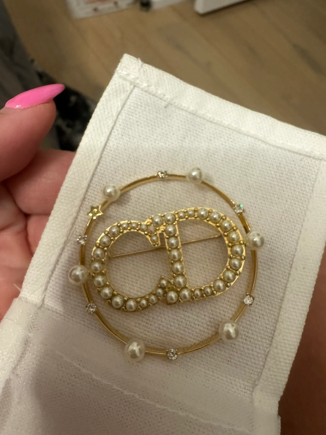The Clair D Lune brooch is a timeless and elegant accessory. The 'CD' initials showcase embedded white resin pearls, framed by a gold-finish metal circle on which a multitude of crystals and resin pearls appear, as well as a star. It will brighten the silhouette if displayed on a coat.