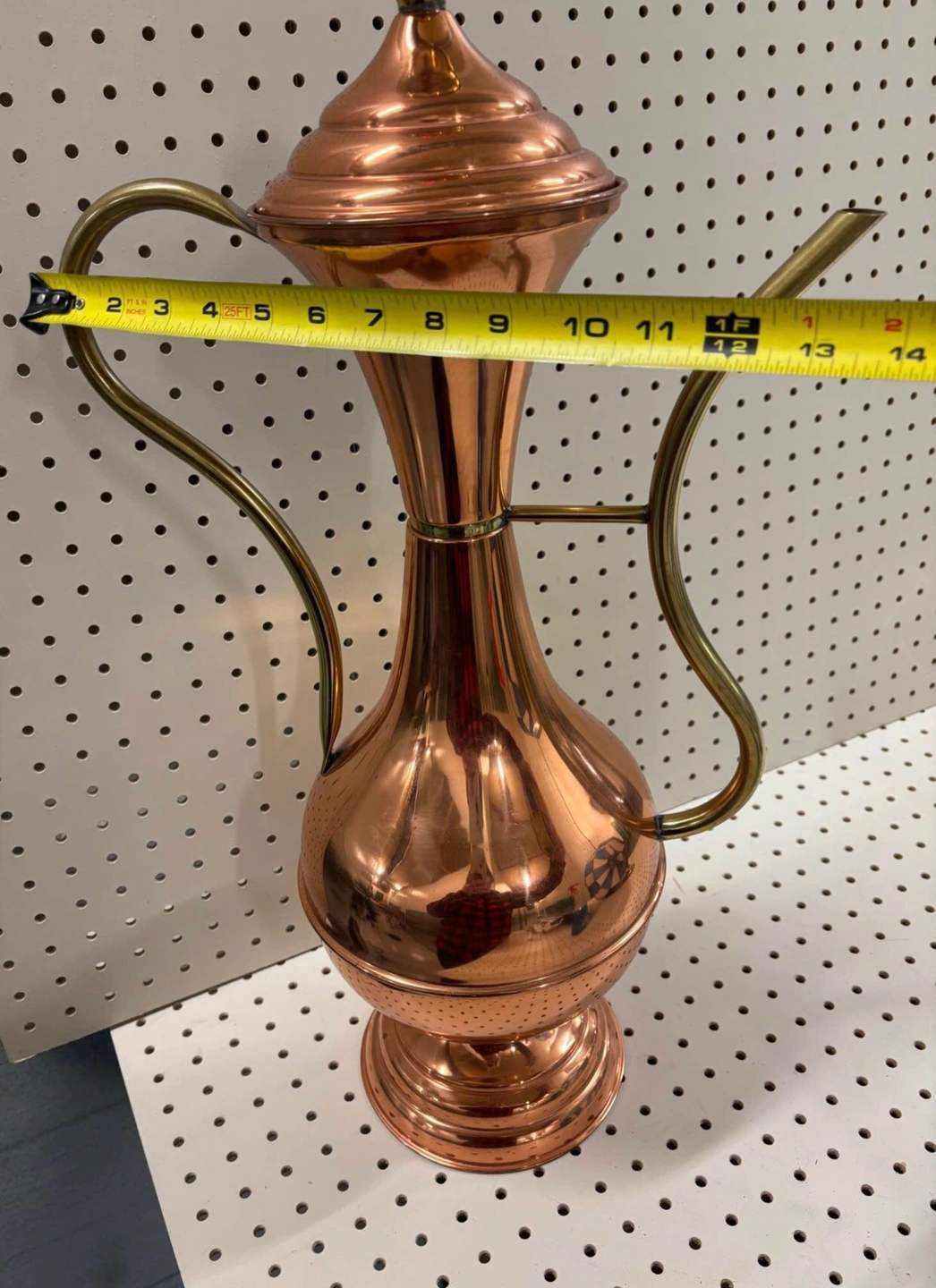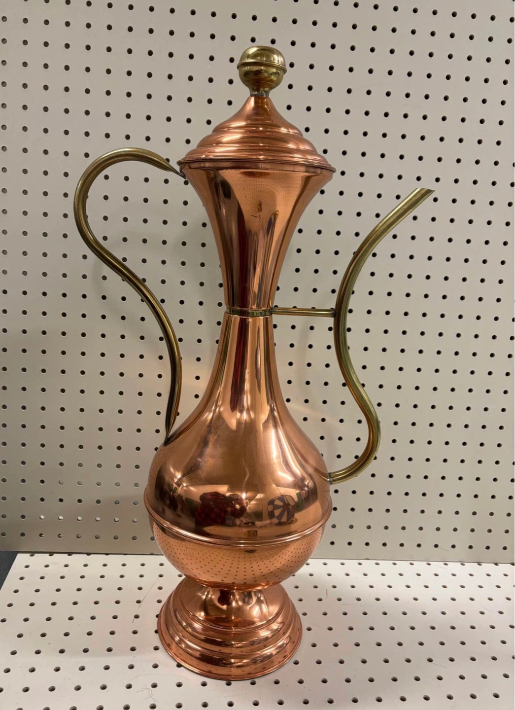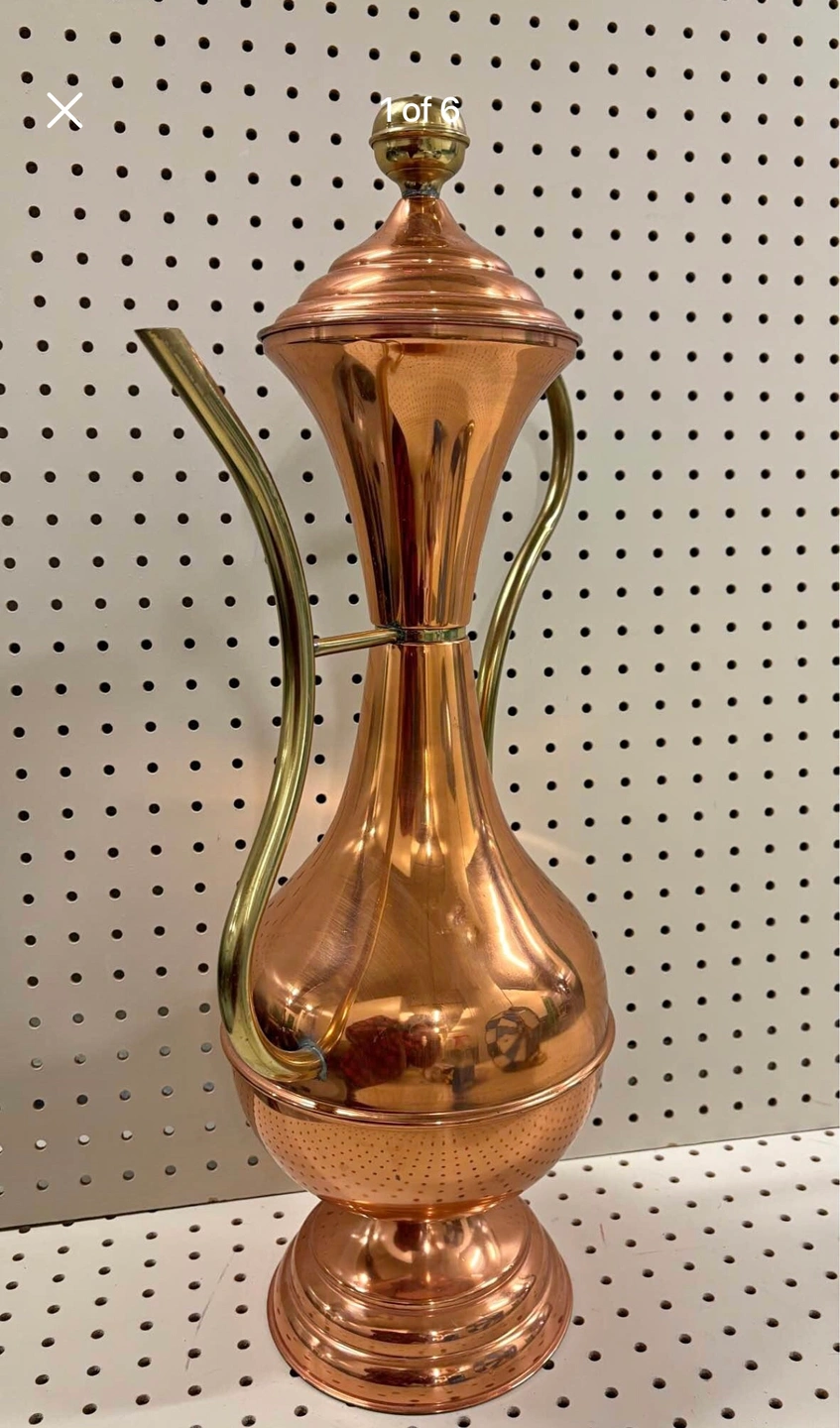 Rare find! This is a beautiful piece - mostly copper with brass accents on the handle, spout, and finial. It is vintage so there is some marks on the finish - but mostly in beautiful condition.