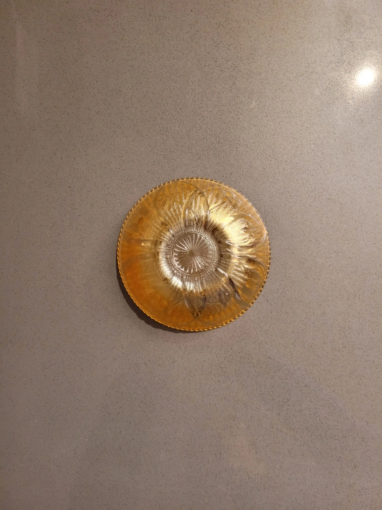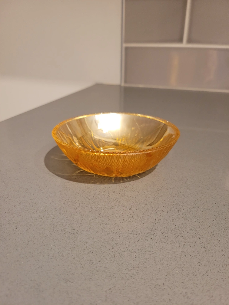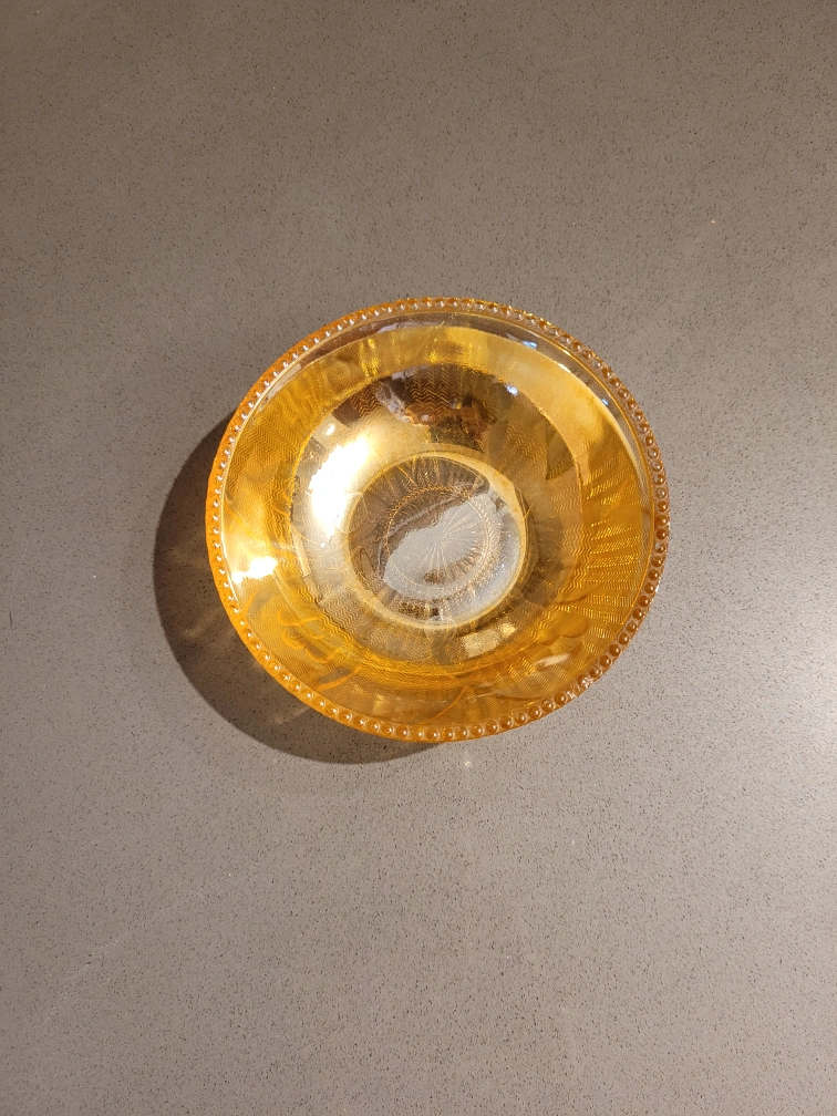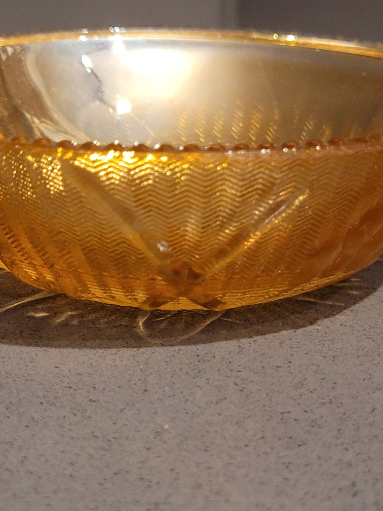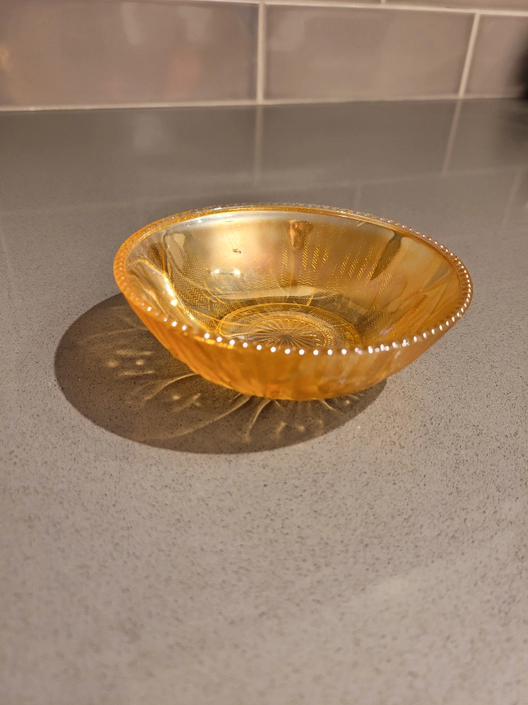 Stunning shine and orangish color. Jeanette Iris & Herringbone Iridescent Depression Glass Little Bowl Vintage 4.5" wide and 1.5" high.