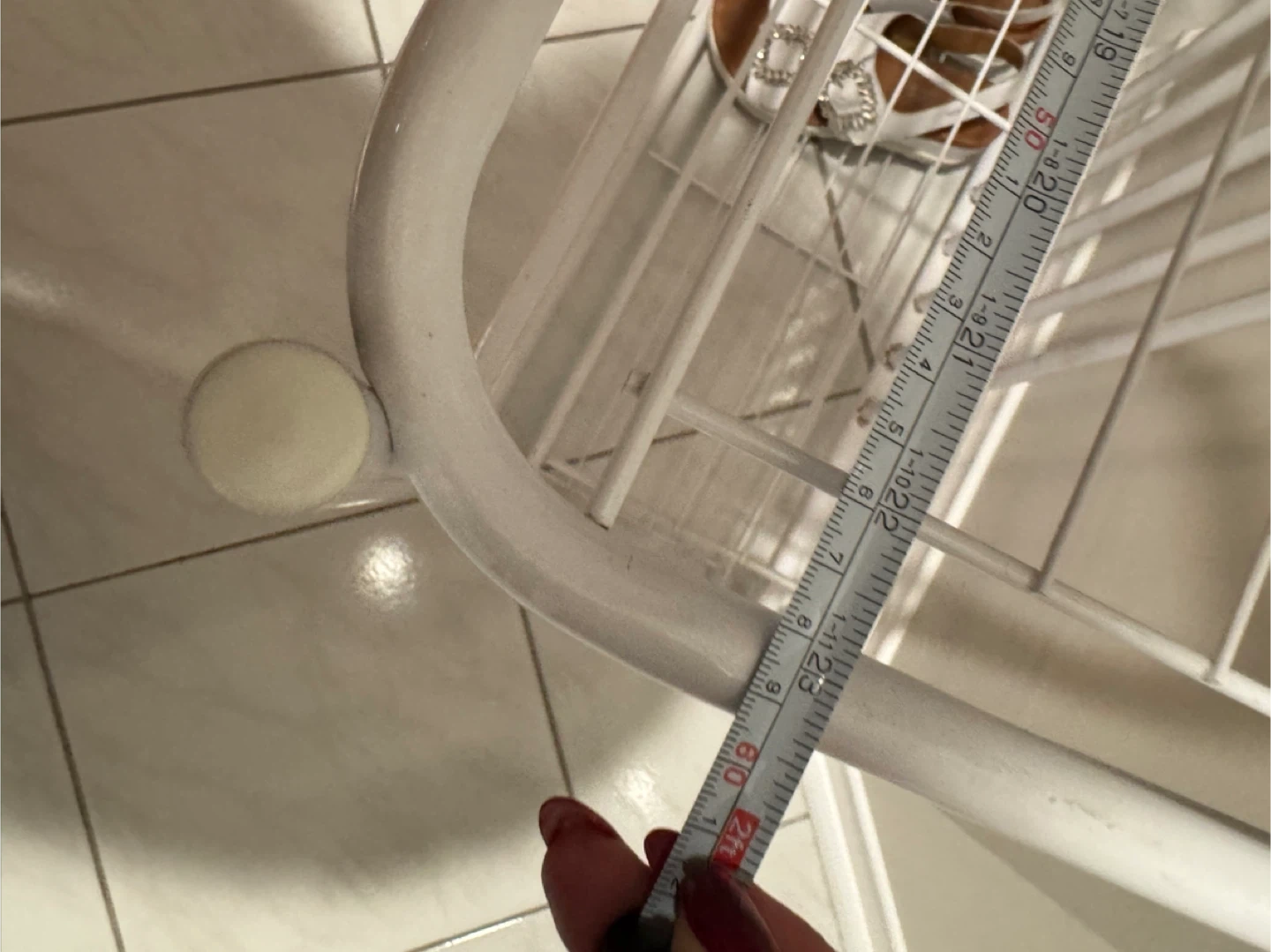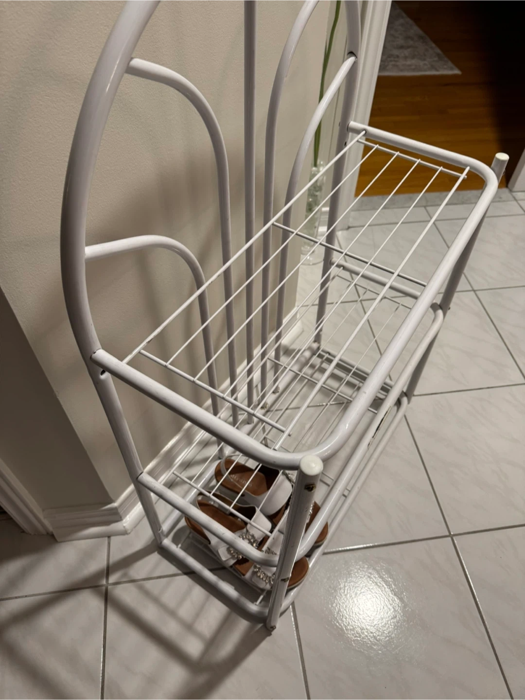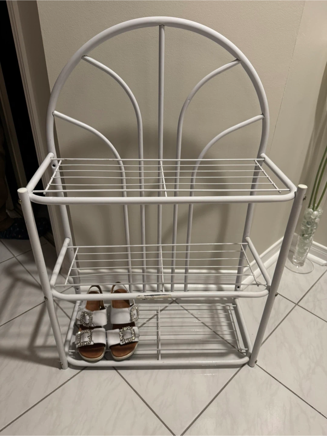 A white metal shoe rack with three tiers. It has a decorative arched top. Perfect for organizing footwear by your entryway. Can also be screwed into the wall and use as shelf. Measures approximately 30 inches tall. Look at the pictures for measurements.