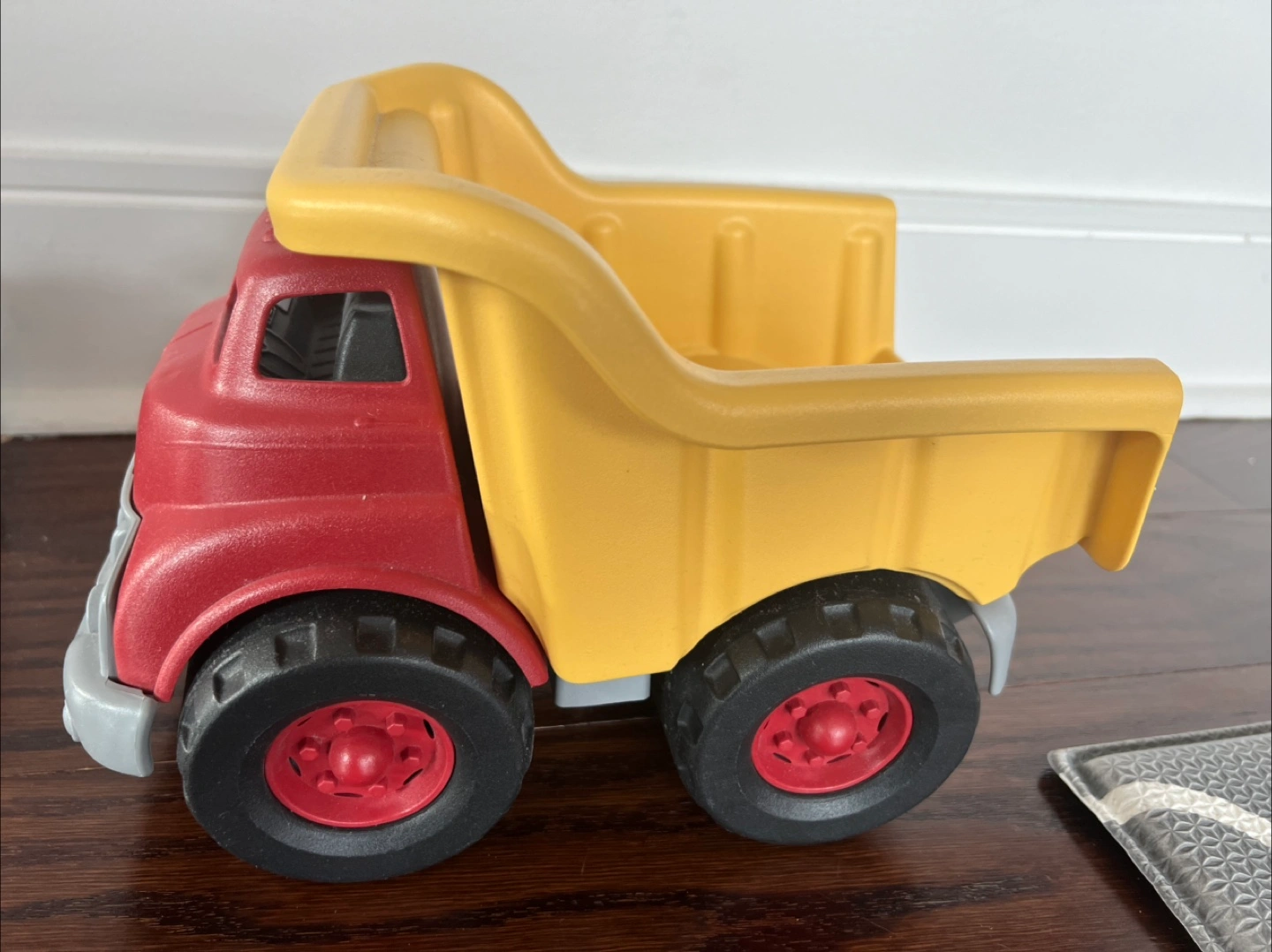Selling a very gently used Green Toys Dump Truck! This sturdy truck is perfect for little ones who love to play in the sand or dirt. It features a bright red cab and a yellow dump bed. Great for imaginative play!