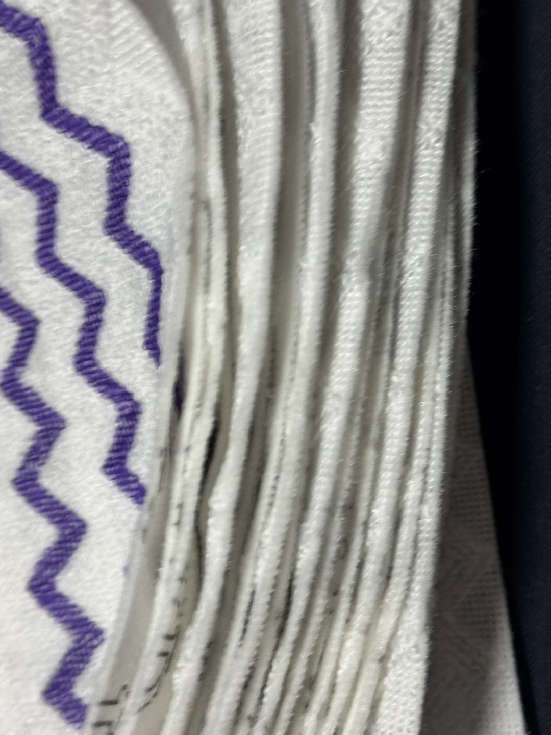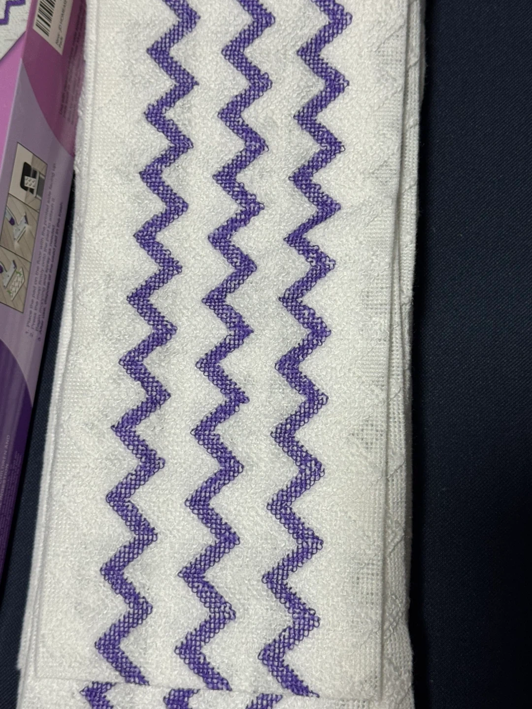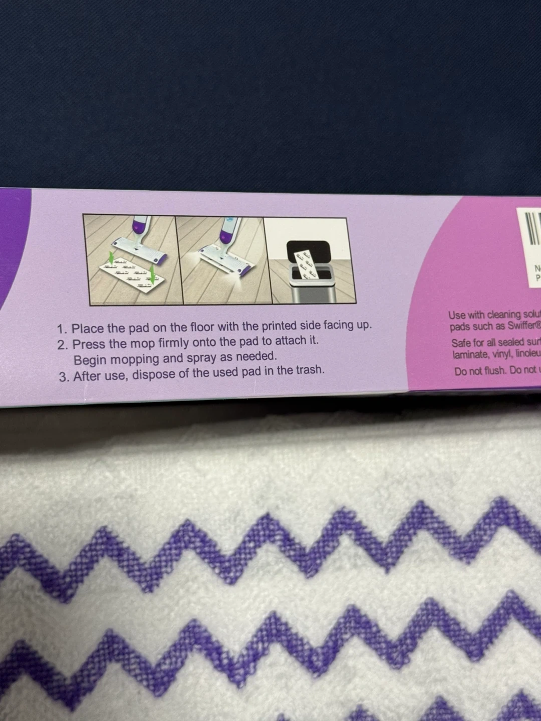 Selling mopping pad refills. They are white with a purple zig-zag pattern. The box includes instructions for use: Place the pad on the floor with the printed side facing up, press the mop firmly onto the pad to attach it, and begin mopping and spray as needed. After use, dispose of the used pad in the trash.