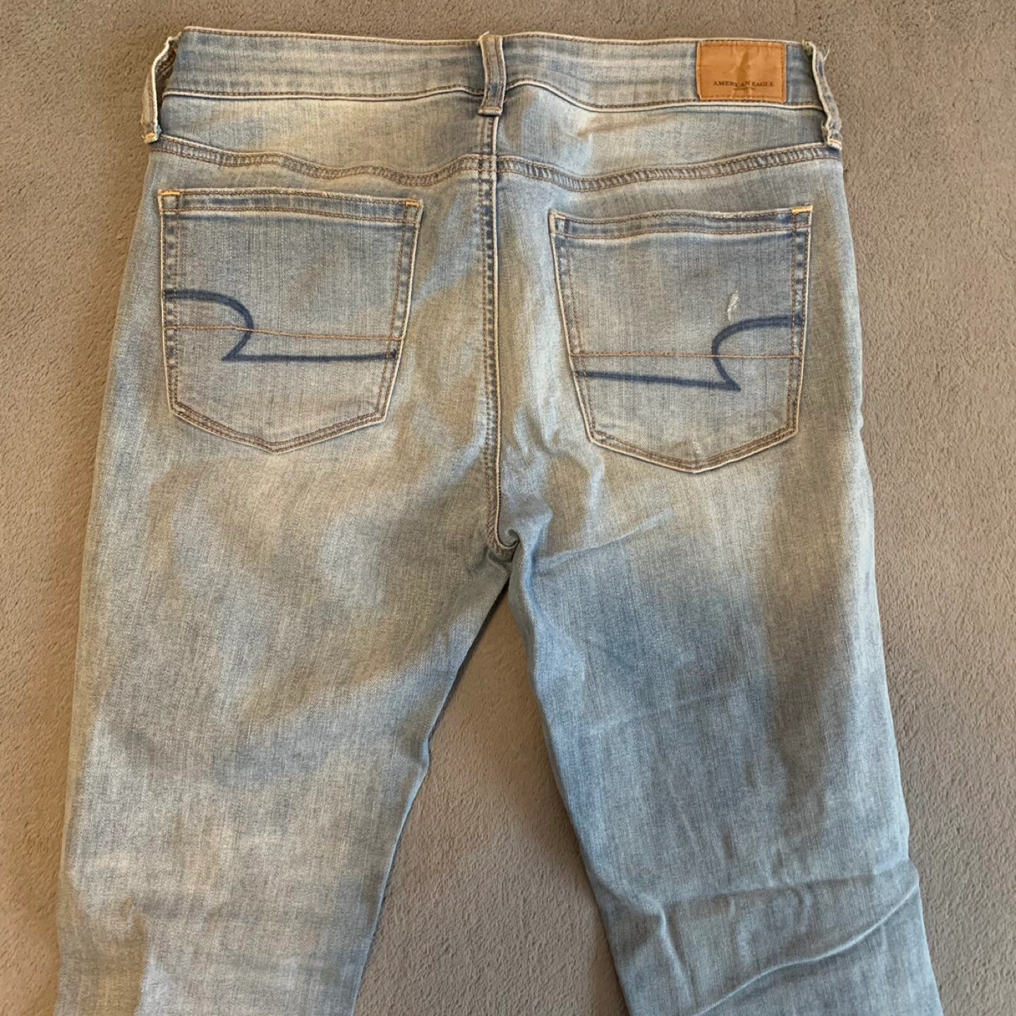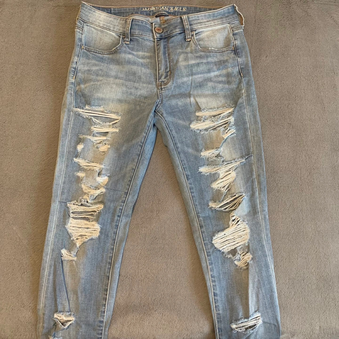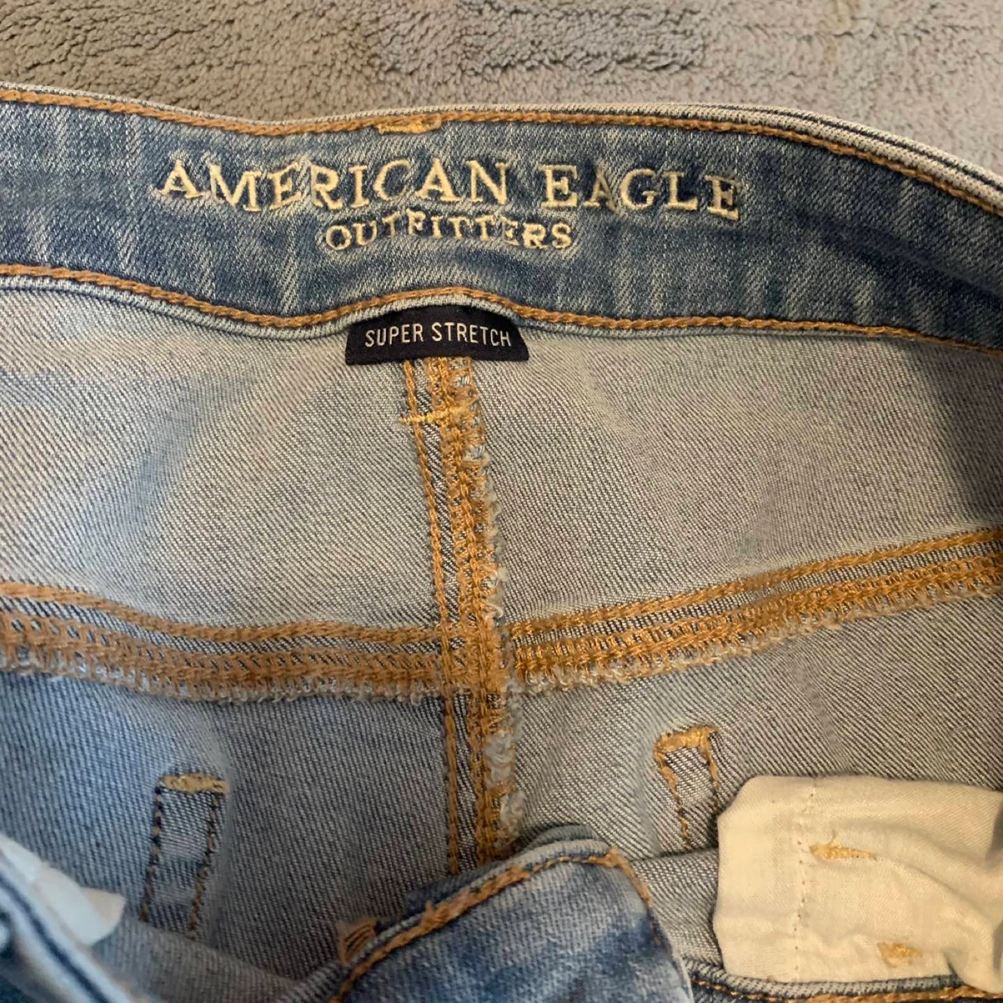 Like new American Eagle low rise, light wash, distressed jeans. The colour is much better in person, it’s simply light blue. Stretchy fabric, tight fit, make the booty look nice ✅