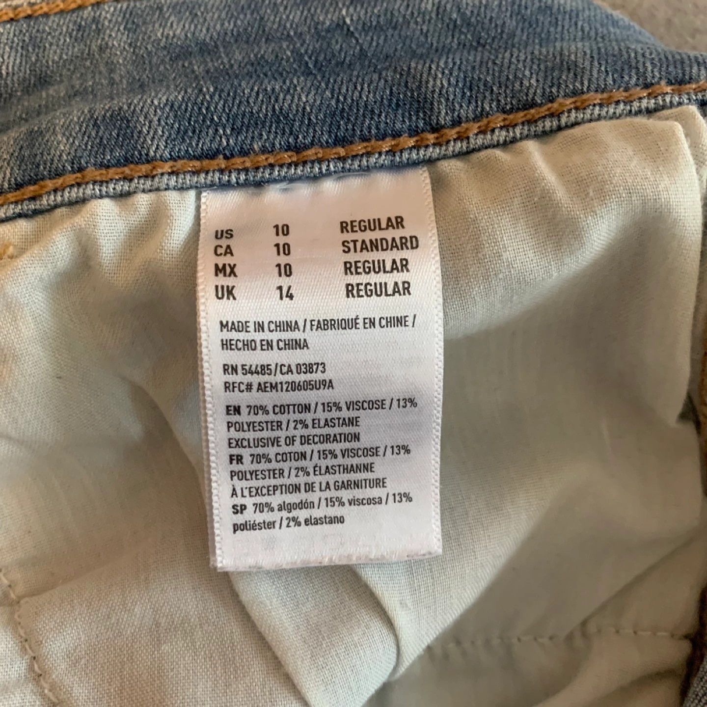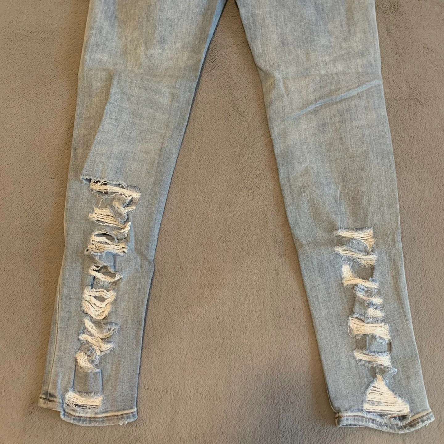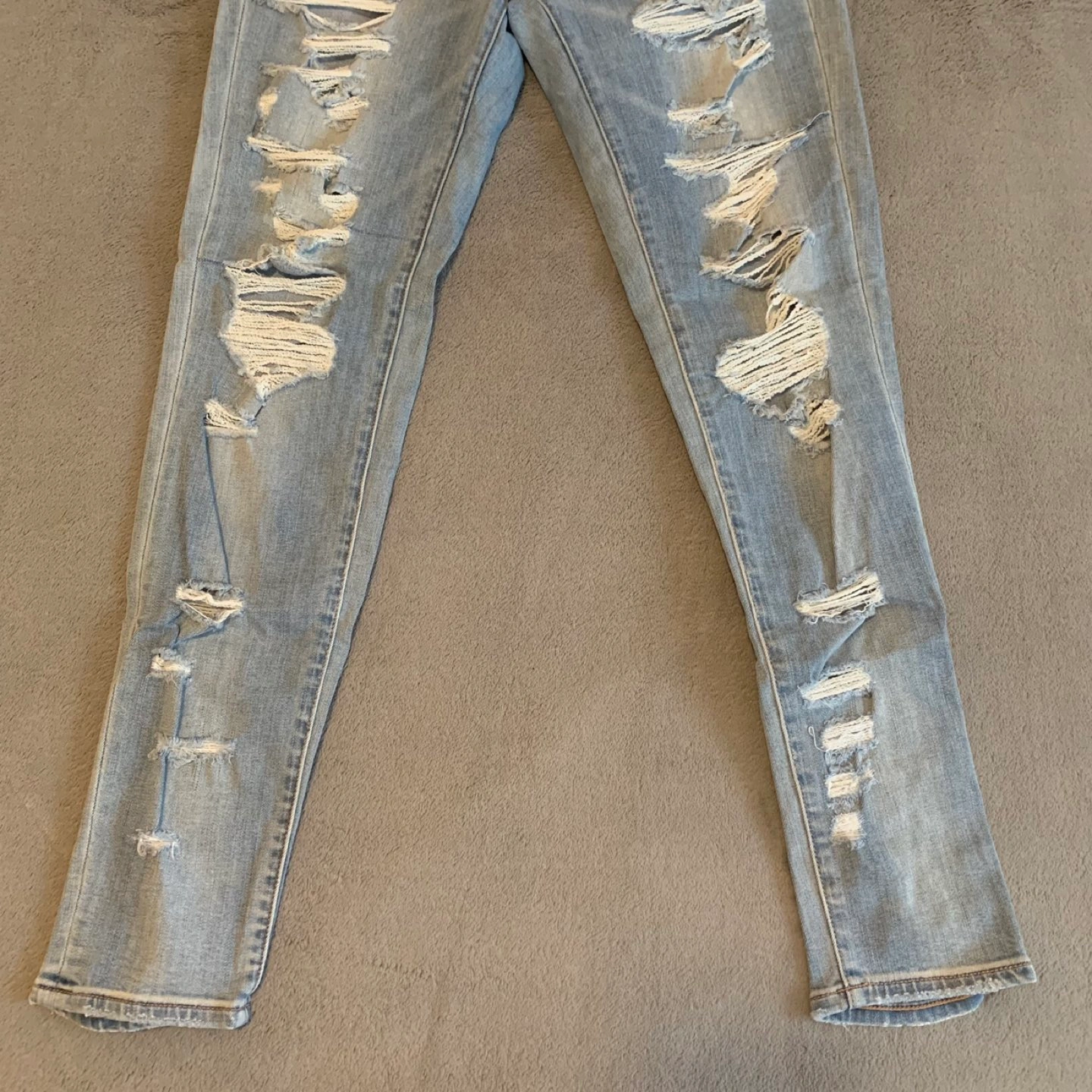 Like new American Eagle low rise, light wash, distressed jeans. The colour is much better in person, it’s simply light blue. Stretchy fabric, tight fit, make the booty look nice ✅