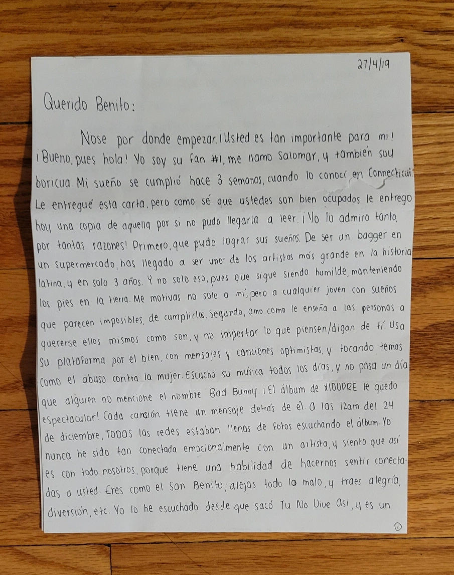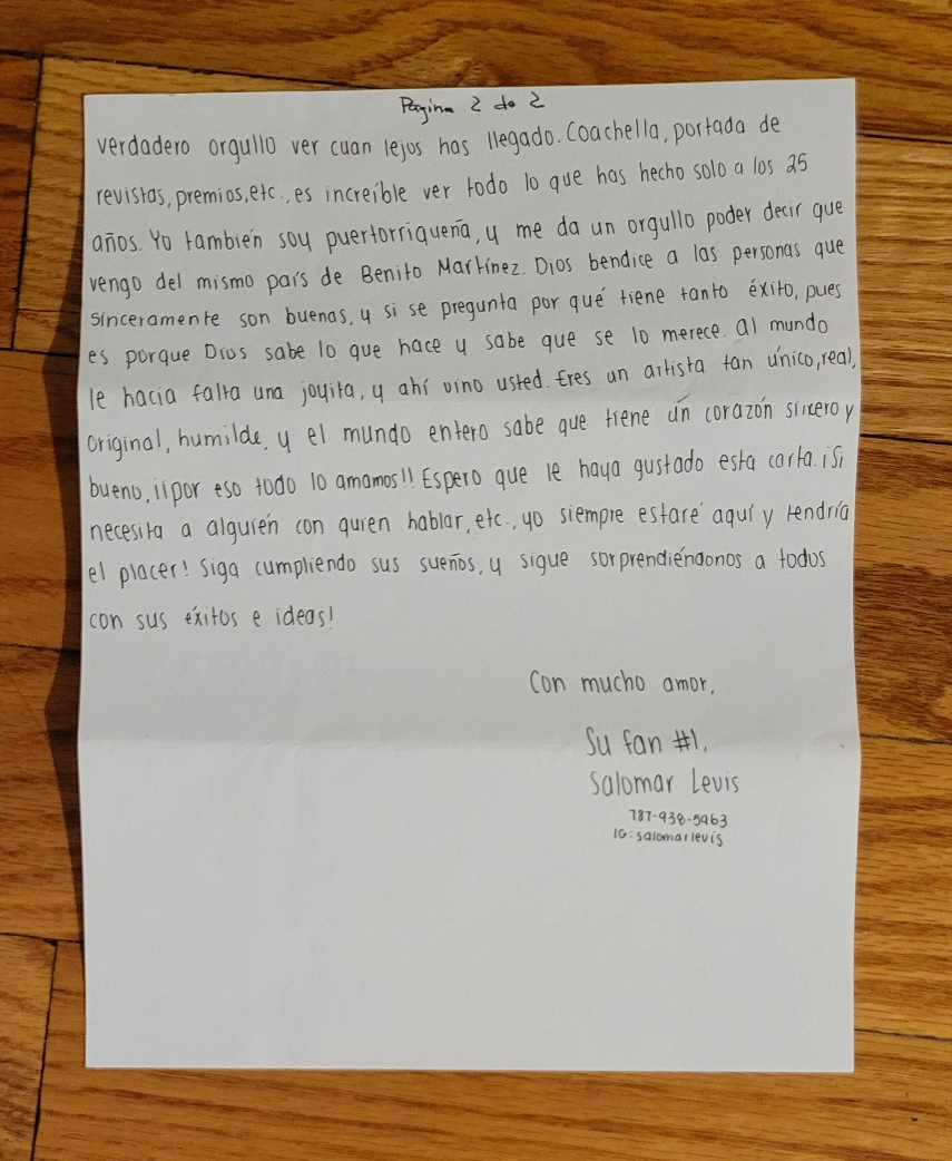 Great original photo of Bad Bunny and Fan (year 2019) with great letter from the fan to the celebrity.