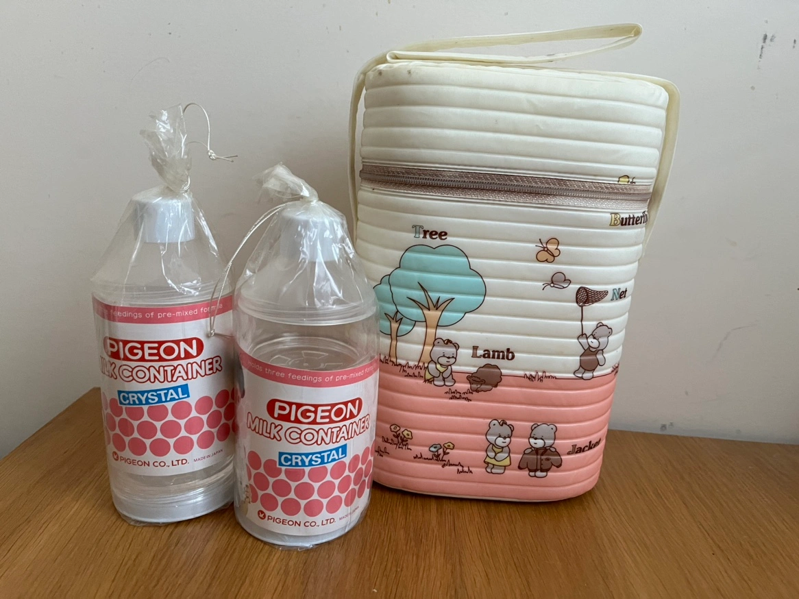 Insulated Carrier fits two bottles. Two stacks of formula containers each for three feedings. Made in Japan.