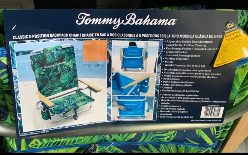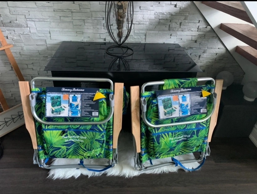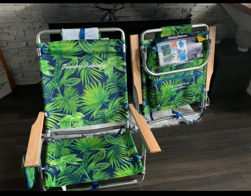 2 Brand new never used 5 position backpack chairs. Bamboo armrests. Still have original Tommy Bahama labelling. Paid $137 each selling each chair $70 dollars