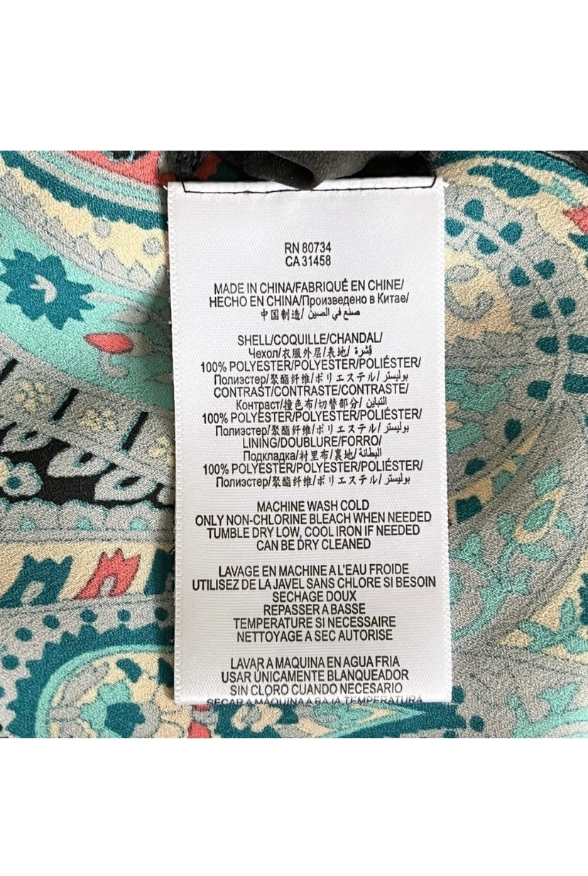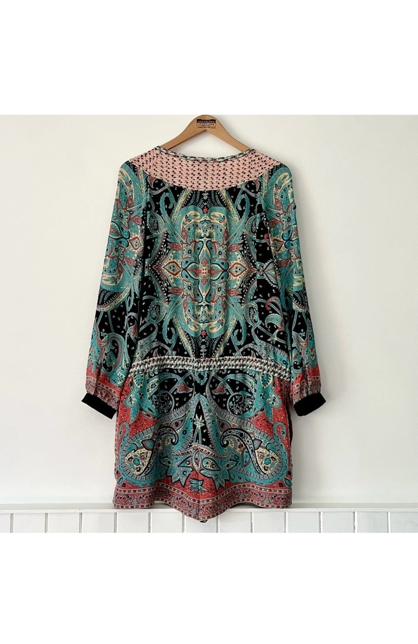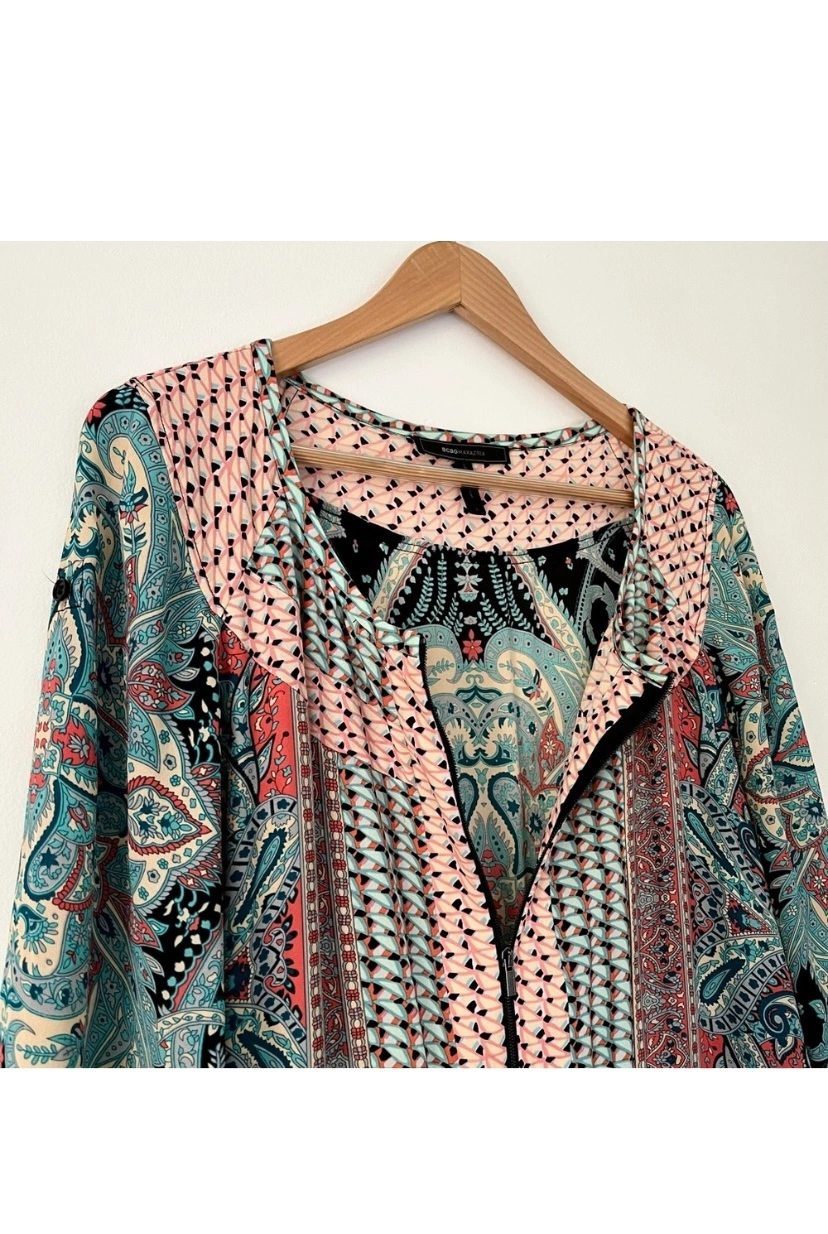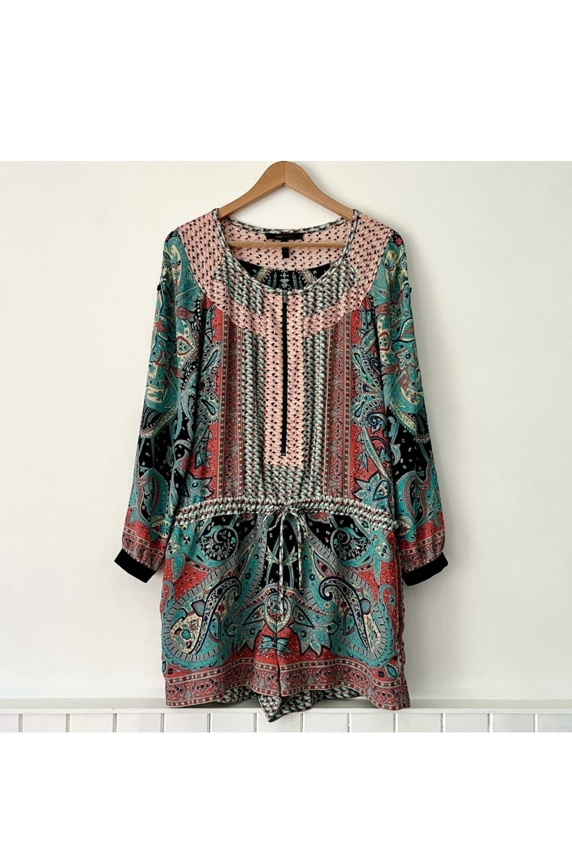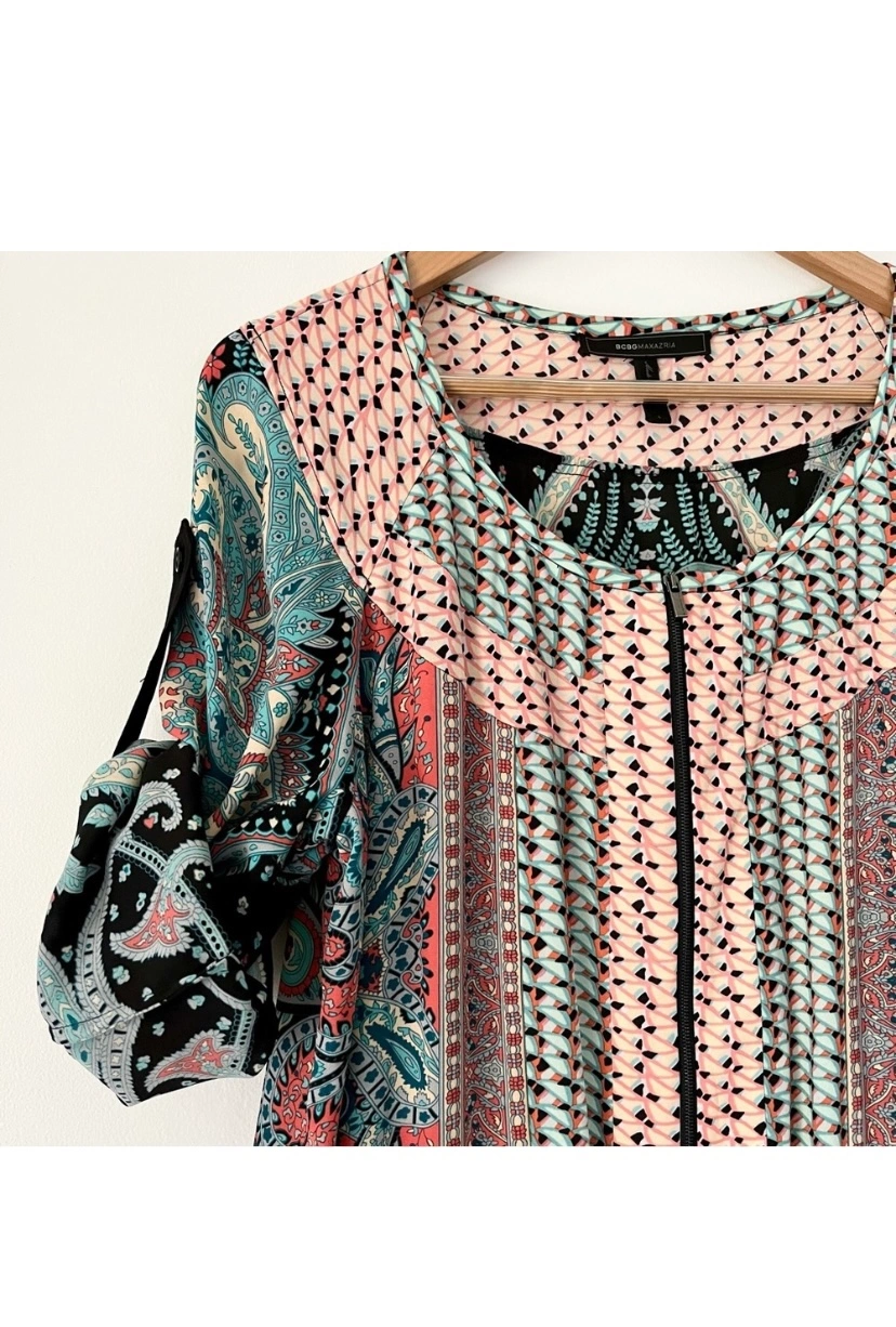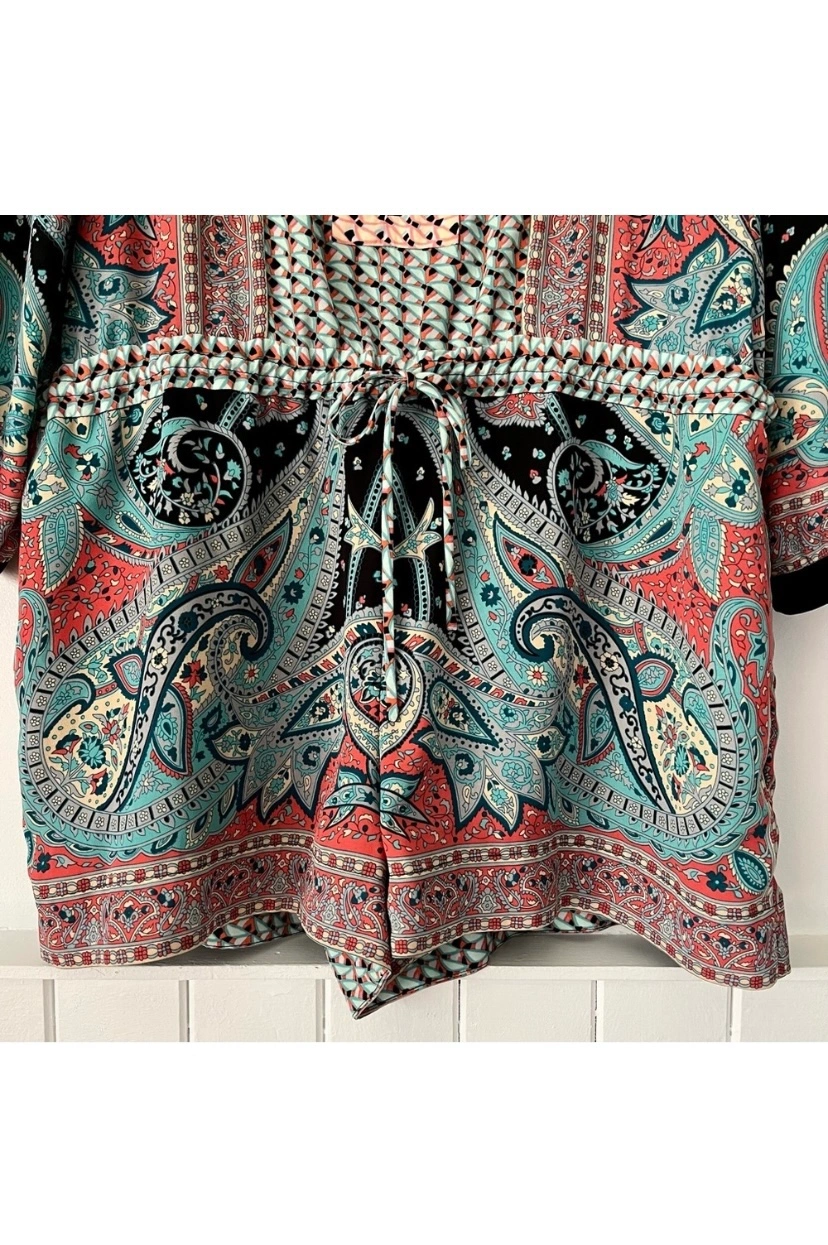 BCBGMax Azria paisley design. Zipper in front and roll tab sleeves which can be worn long or short. Silky and lightweight. The shorts are lined and have a drawstring waist.