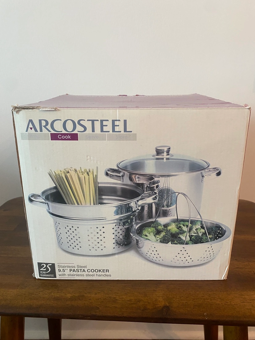 Like new. Stainless steel 9.5” pasta cooker pot.