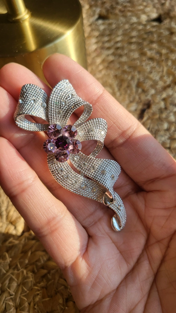 silver tone brooch with white and purple crystals from Europe.