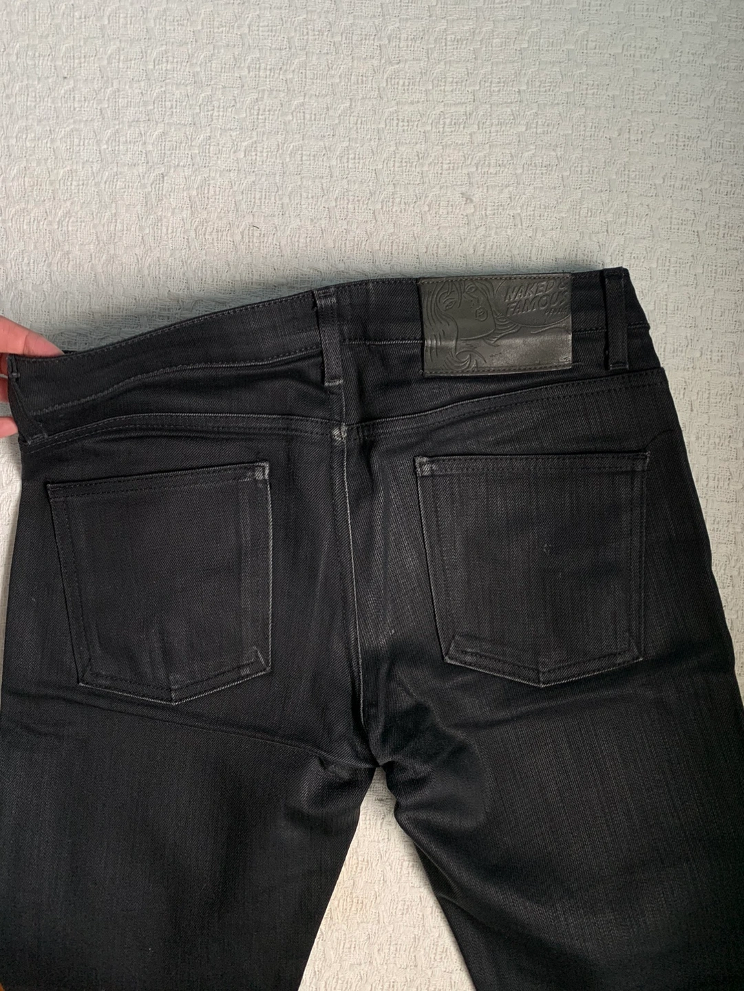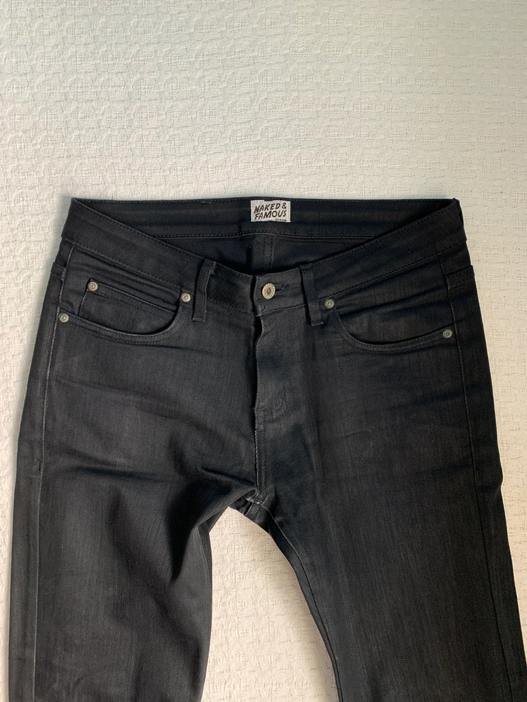 Well worn, well loved, and well taken care of jeans. They don't fit me anymore, but Naked and famous makes a great product so they still have a lot of life in them. Fit is tight/straight leg. More formal than casual