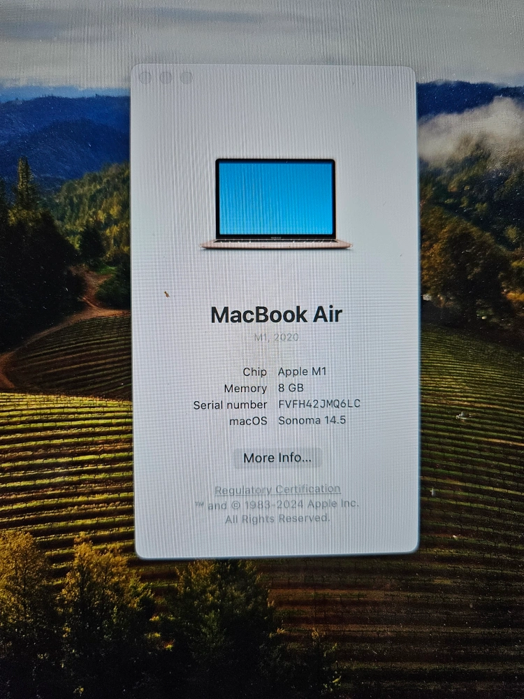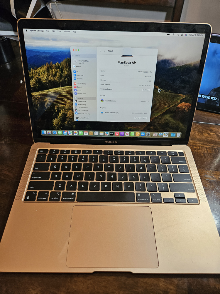macbook air . gold ( but looks pink / rose gold in colour ) . chip : Apple M1 8GB .