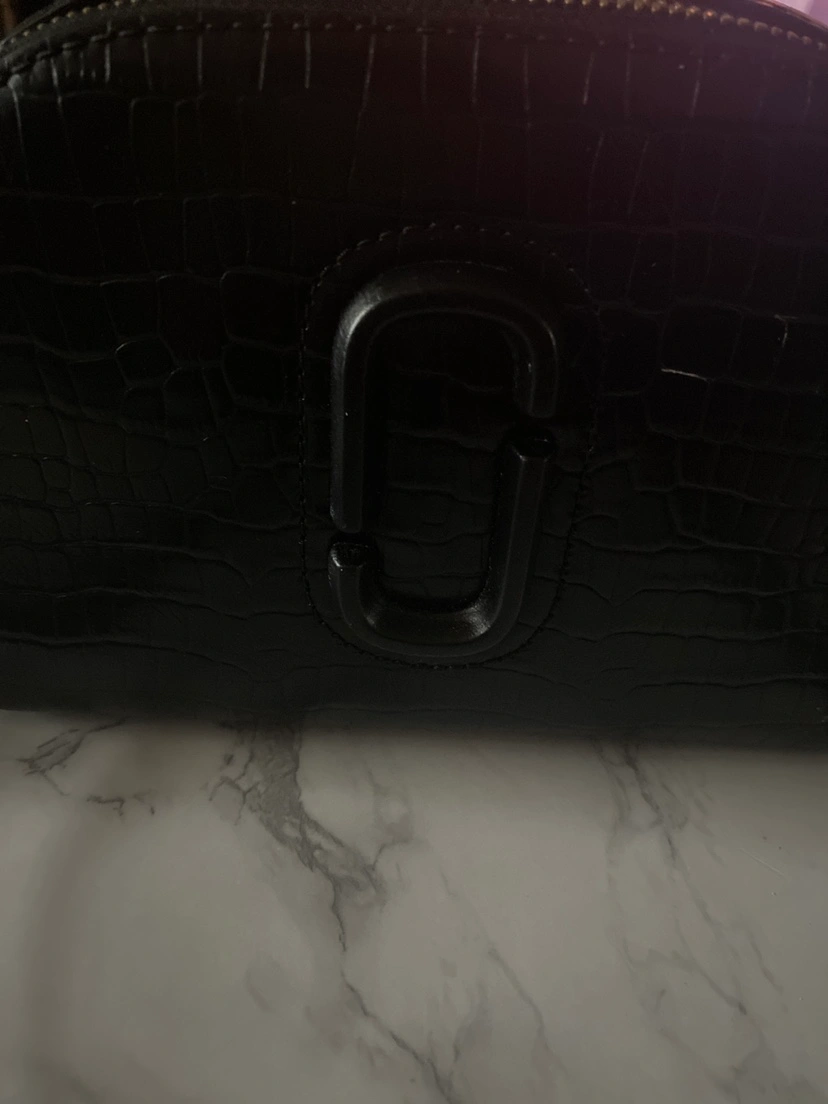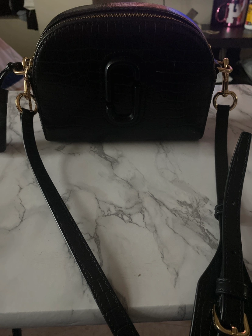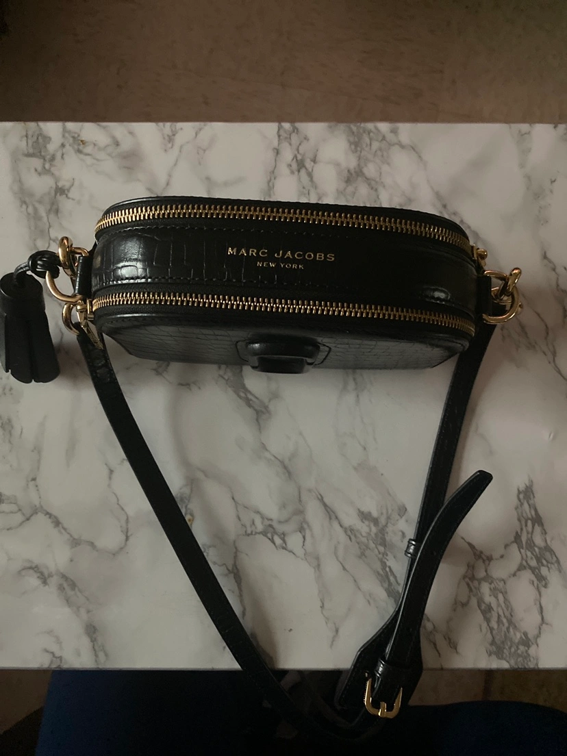 Black sleek purse, with two zipper pockets and gold hardware. Very stylish and cute. Only use a few times!!