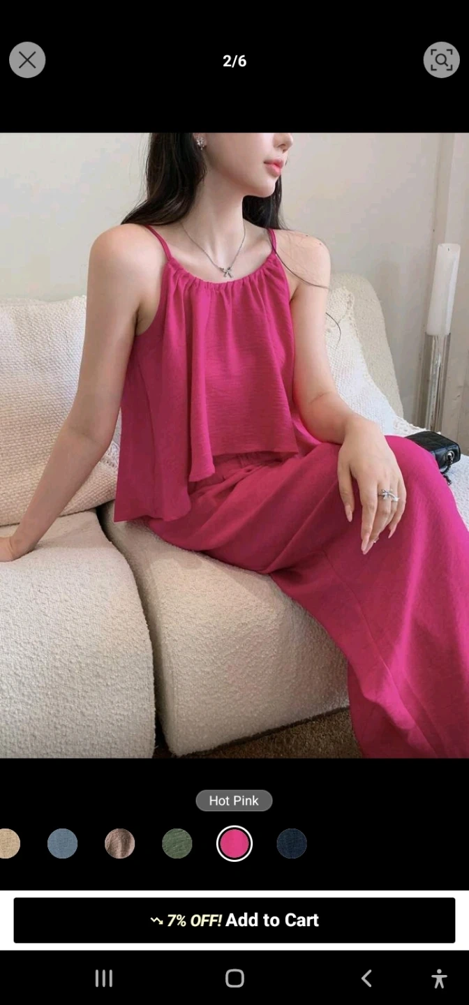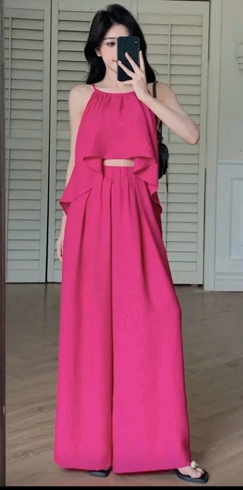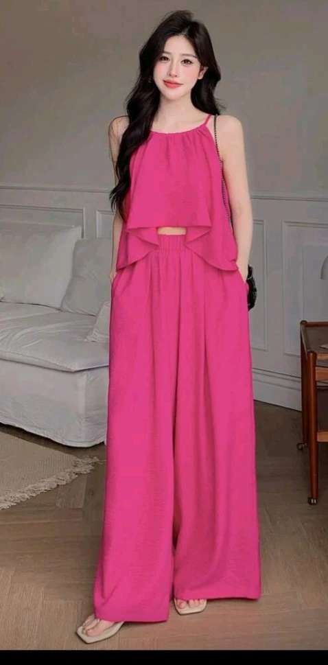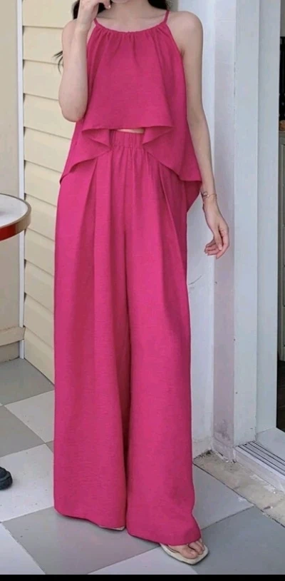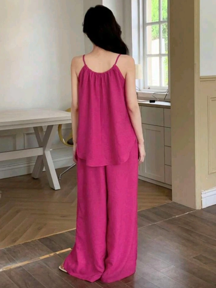 This flowy two-piece set comes in a vibrant hot pink colour. It includes a camisole top with spaghetti straps and a ruffled hem, paired with wide-leg pants that have an elastic waistband and pockets. Made from a lightweight, textured fabric.
