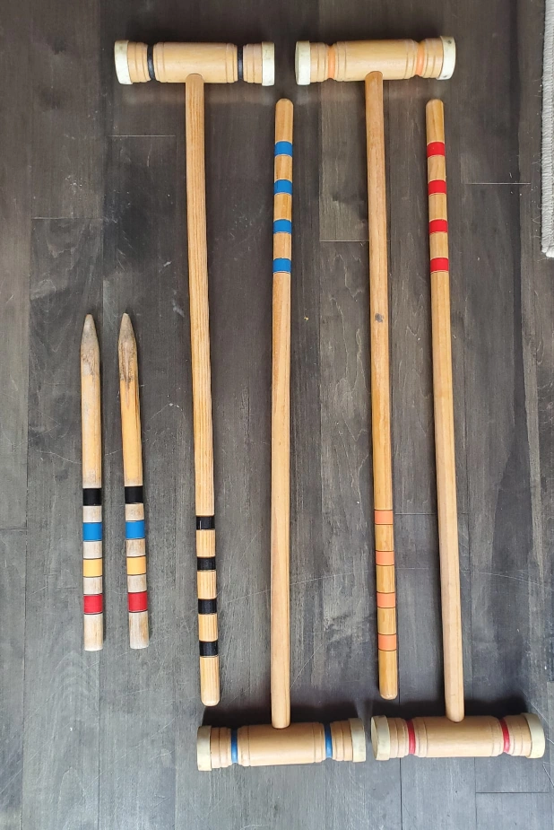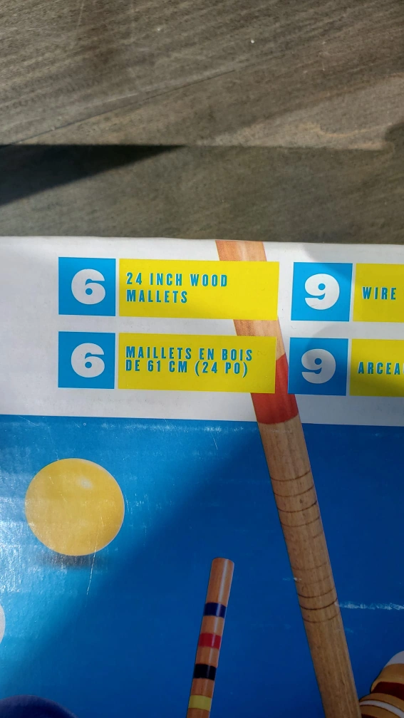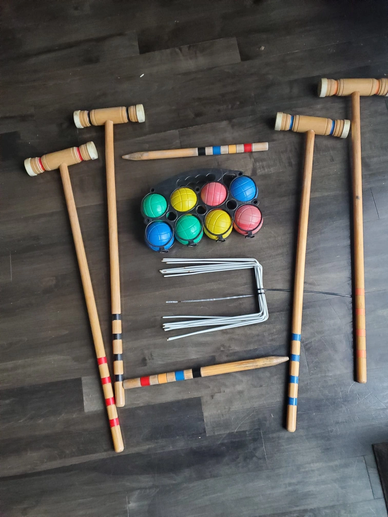 Pointyard Six Player Croquet Set, 28" Croquet set with wooden mallets/ colored balls/wickets/stakes for adults/teens/family-perfect for lawn/ backyard game/ park.In very good condition. Its 22 pieces.