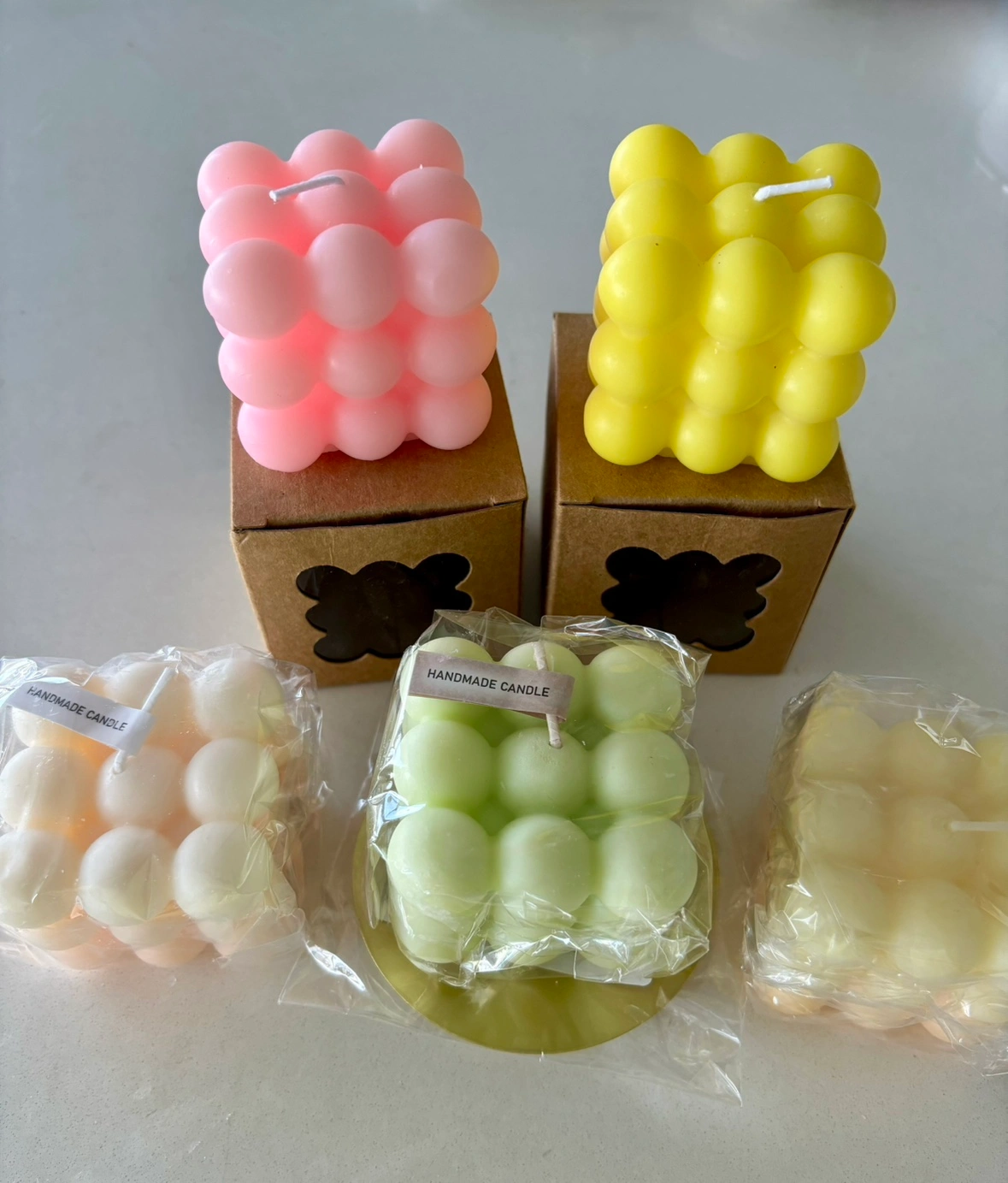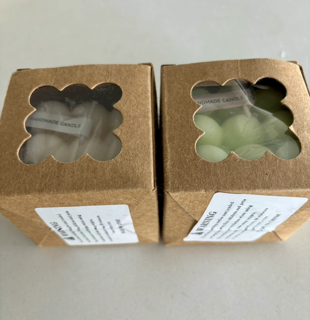 They are (handmade in China) aromatic essential oil scented candles that I purchased a couple of years ago, each with a π¦. The boxes of pure pink and blue ones are in white colour.