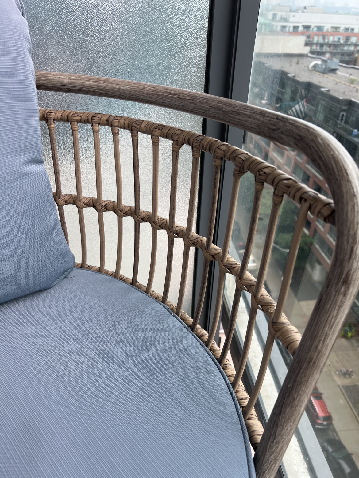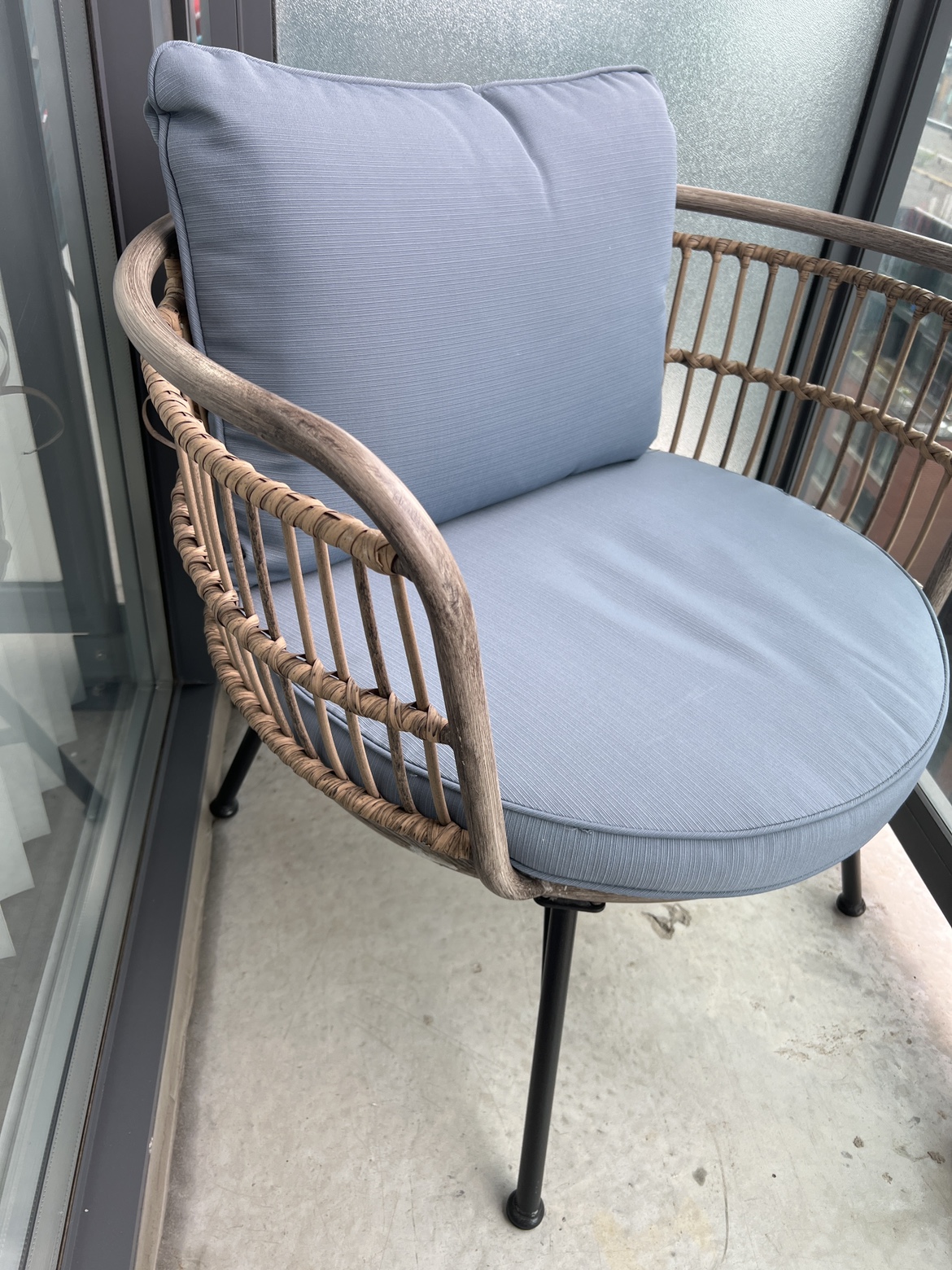 Selling one chair from this set as only one will fit on my balcony. Cushions from the chair that I am selling have never been used and are still in the plastic cover.