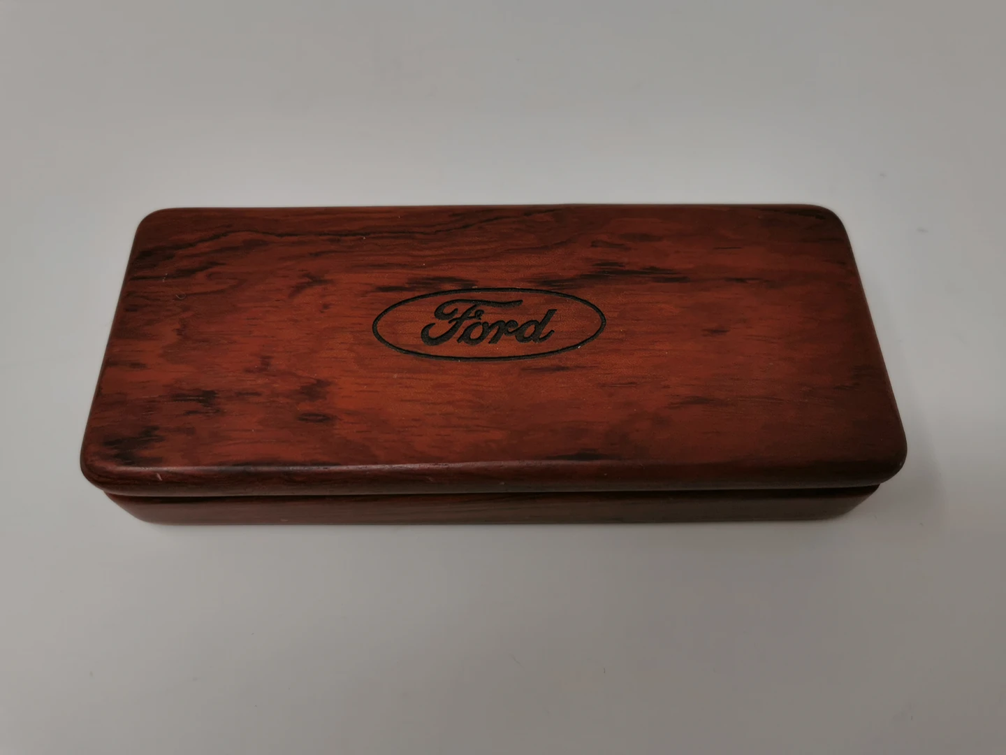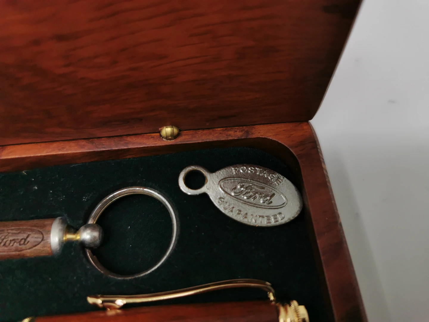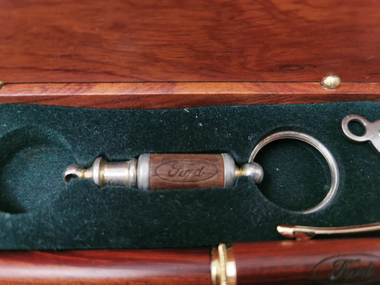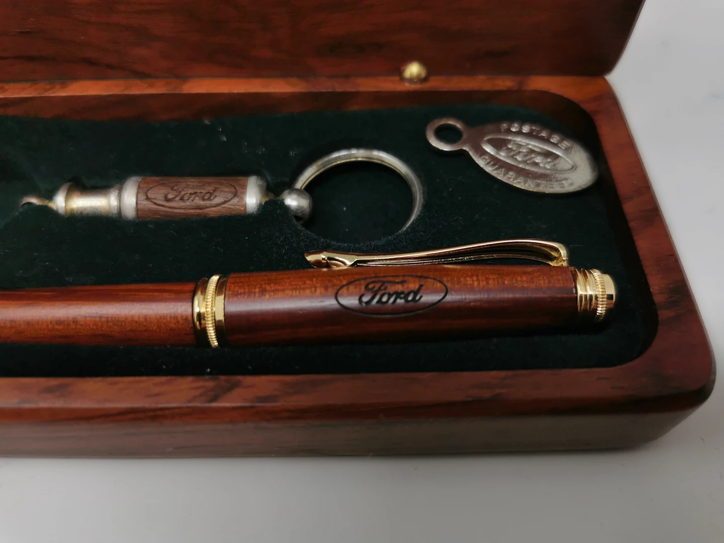 wooden pen works. keychain is missing a piece. in a no ice woo seen display case. pen and case engraved with Ford Motor Company logo