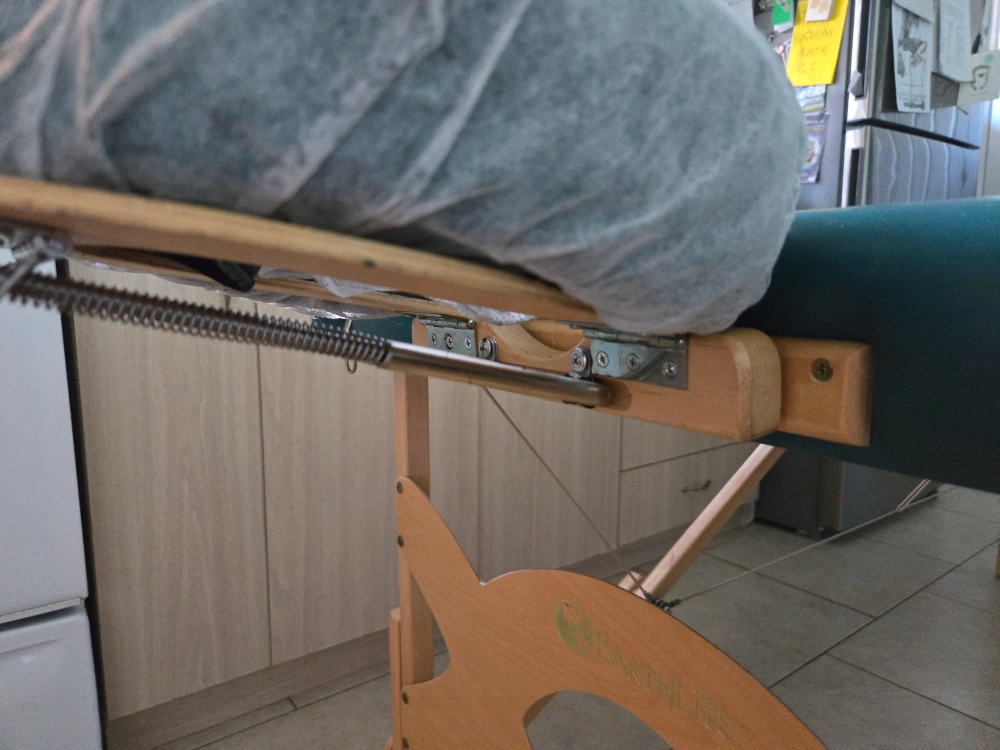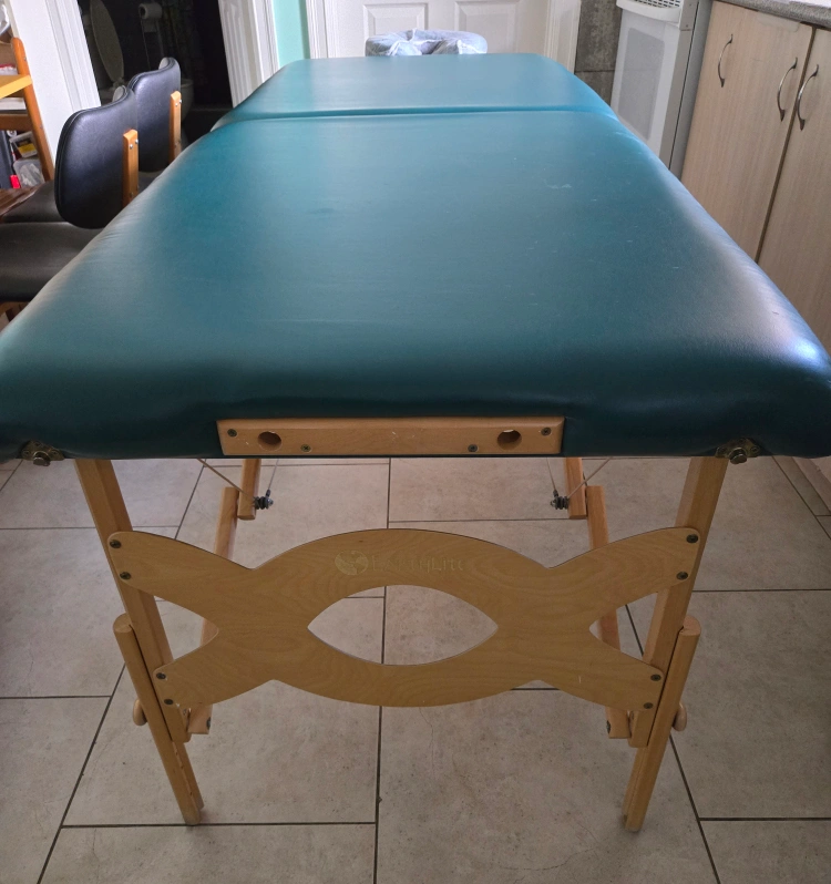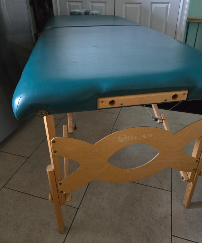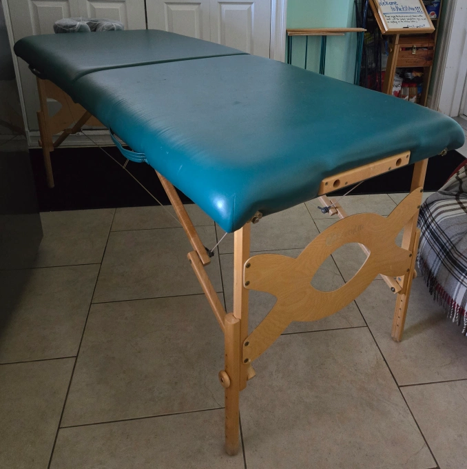 Top of the line Earthlite super light Professional Massage Table with wide, thick cushioning and adjustable height. Comes with adjustable headrest, which I've been using with a cover, as the inside is the only part really showing any wear. Older, but barely used, with old school construction--they literally don't make them like this any more. When the headrest is covered professionally, in excellent aesthetic and working condition. Still one of the most solid, portable, comfortable options available.
